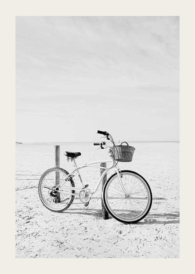 A classic bicycle with a basket is parked on a sandy beach, captured in black and white with the sky as a soft background. The motif has calm lines and generous open space around the bicycle. Black and white colors and a timeless feel make this poster a neutral element in everything from the living room to the hallway.
