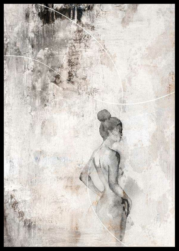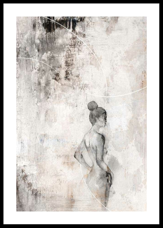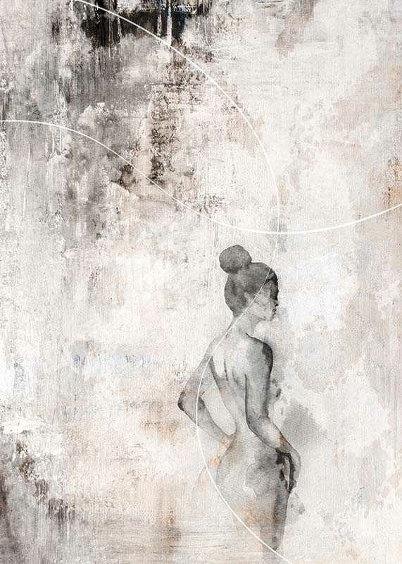 The motif consists of a stylized silhouette of a woman in profile, painted in soft gray tones and watercolor style. The neutral, sand-colored background has a structured, abstract pattern with discreet lines moving across the surface. This poster gives a calm and artistic expression and is suitable for bedrooms or living rooms.