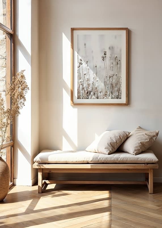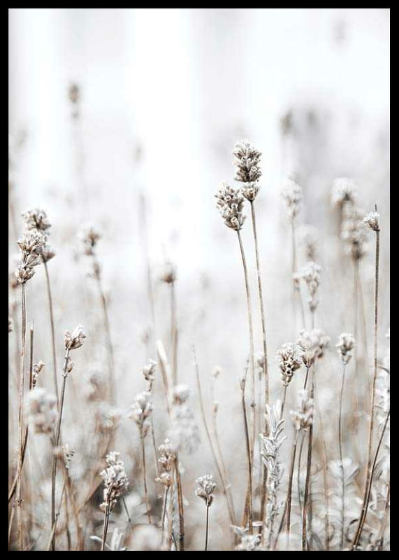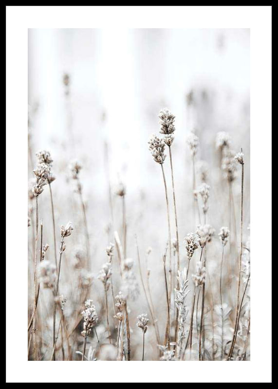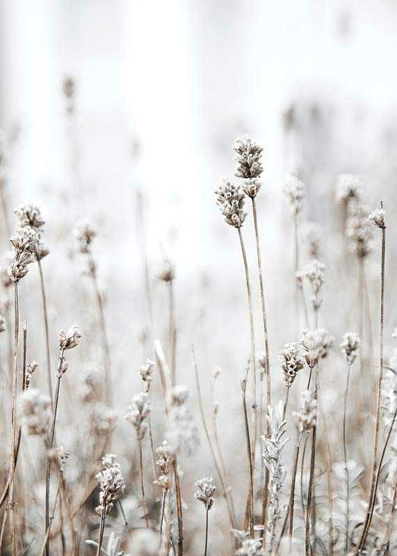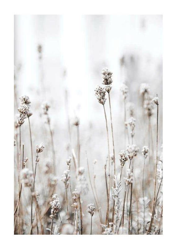 Dried grasses and wild plants with frosty tops rise against a soft and light background in muted beige and brown tones. This poster captures the feeling of the transition between summer and autumn, and provides a tranquil touch of Nordic nature. Suitable for bedrooms, hallways or living rooms where a natural accent is appreciated.