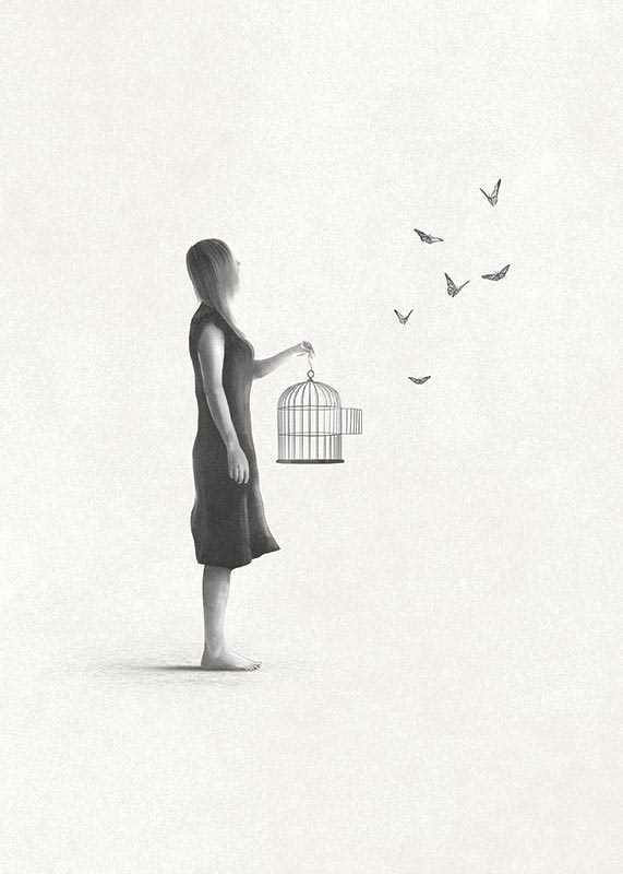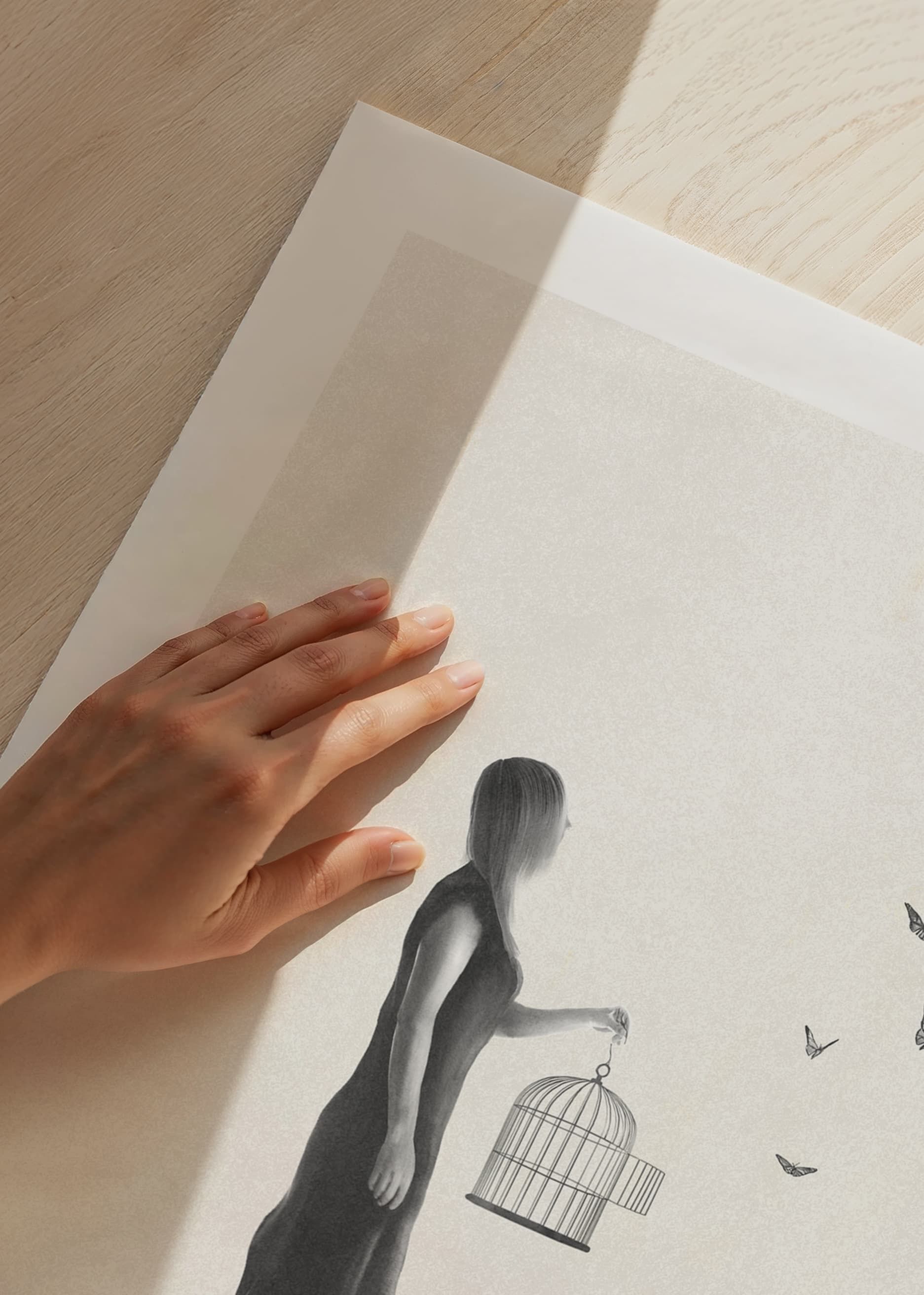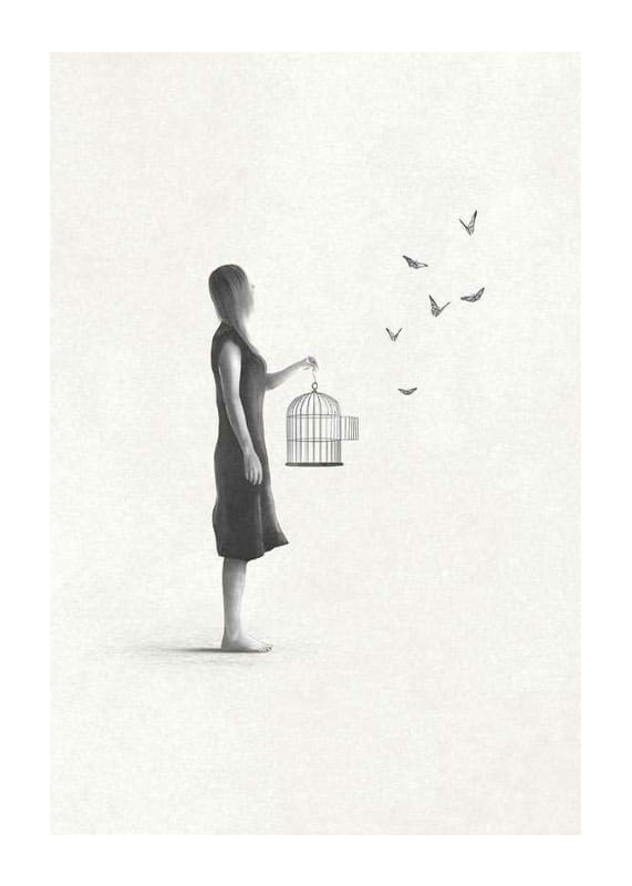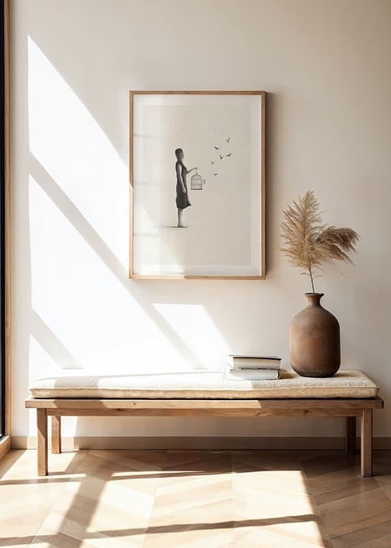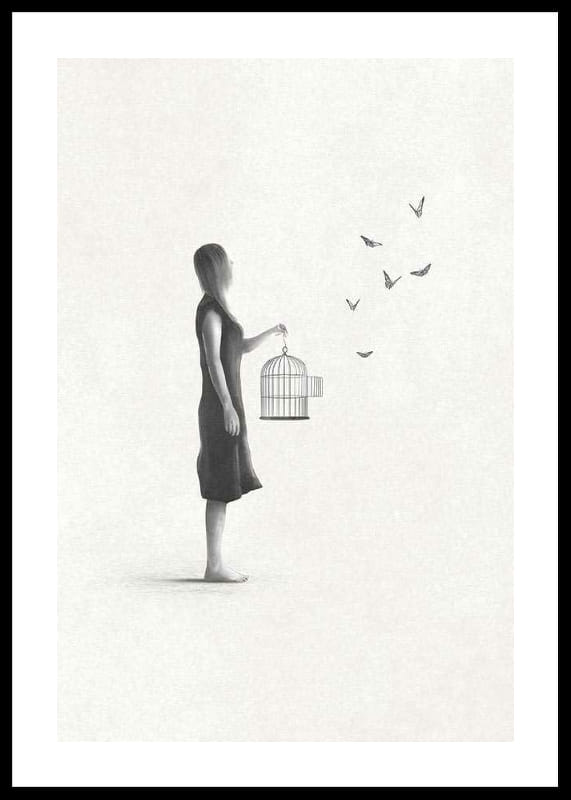 The motif shows a woman in side profile, wearing a simple dress, holding an open birdcage with butterflies flying out to the right. Gray tones and sparse details against a light sand-colored, textured background create lightness and space. As a poster, the motif is suitable for rooms where peace and reflection are desired.