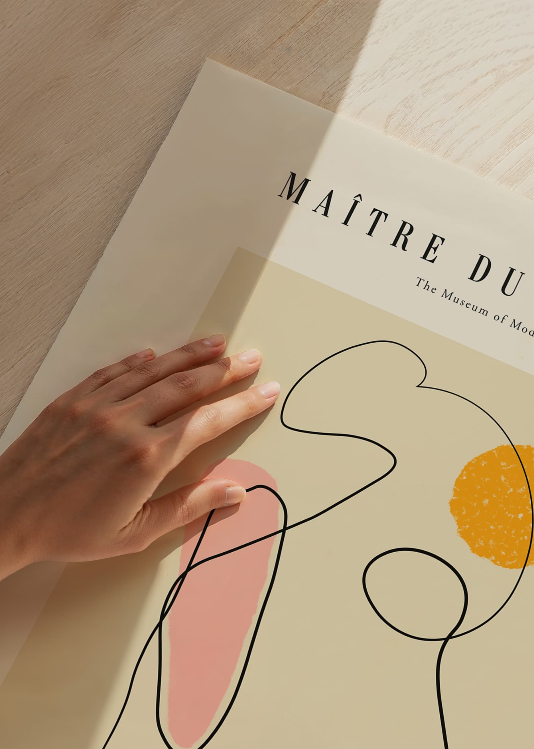 The motif consists of an abstract face drawn with black lines, complemented by two pink fields and an orange circle against a warm, light beige background. Inspired by Picasso's cubist style, this poster gives a modern feel and is suitable for both living rooms and study rooms where artistic accents are appreciated.