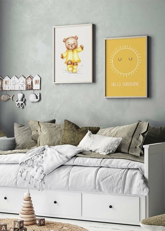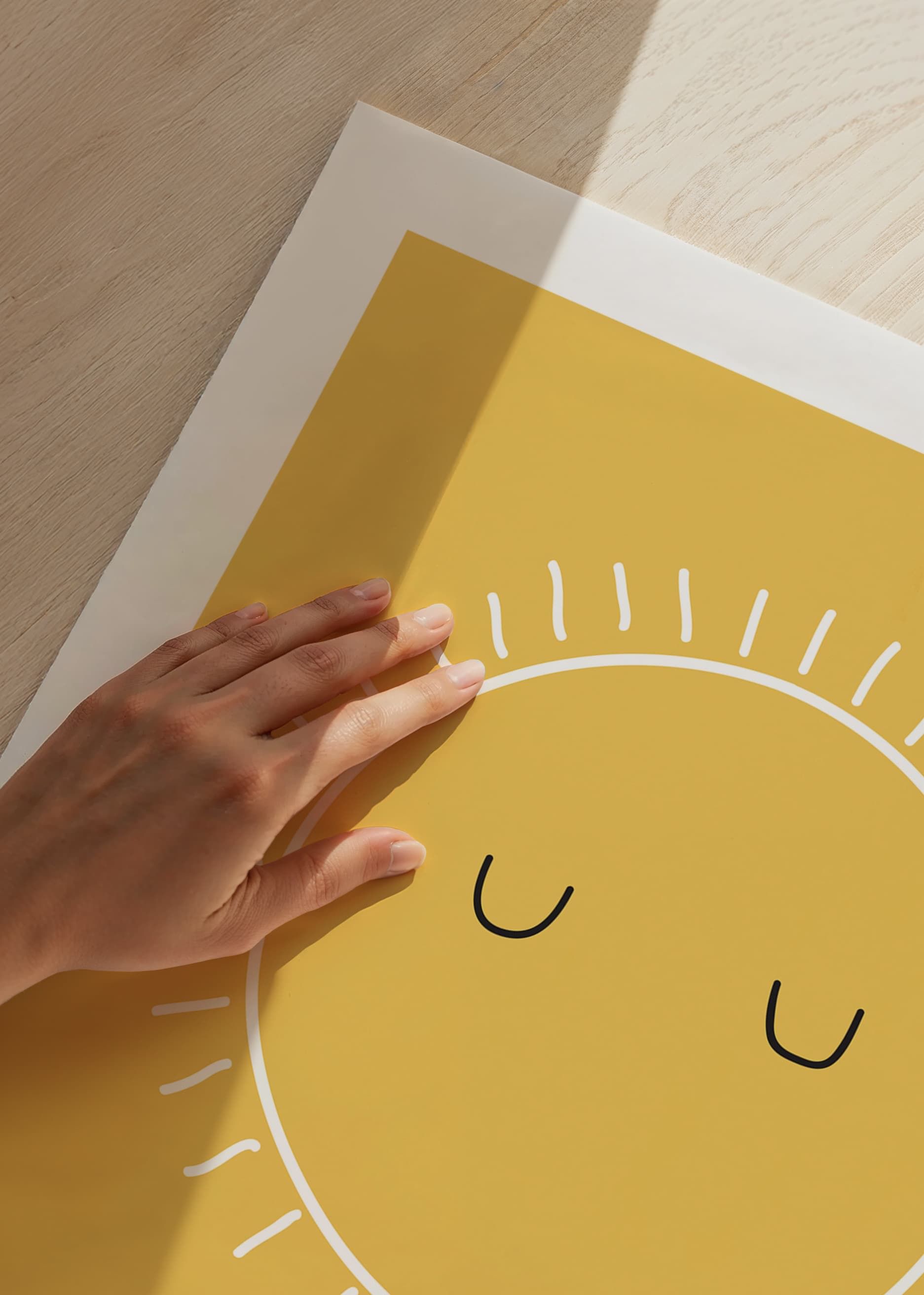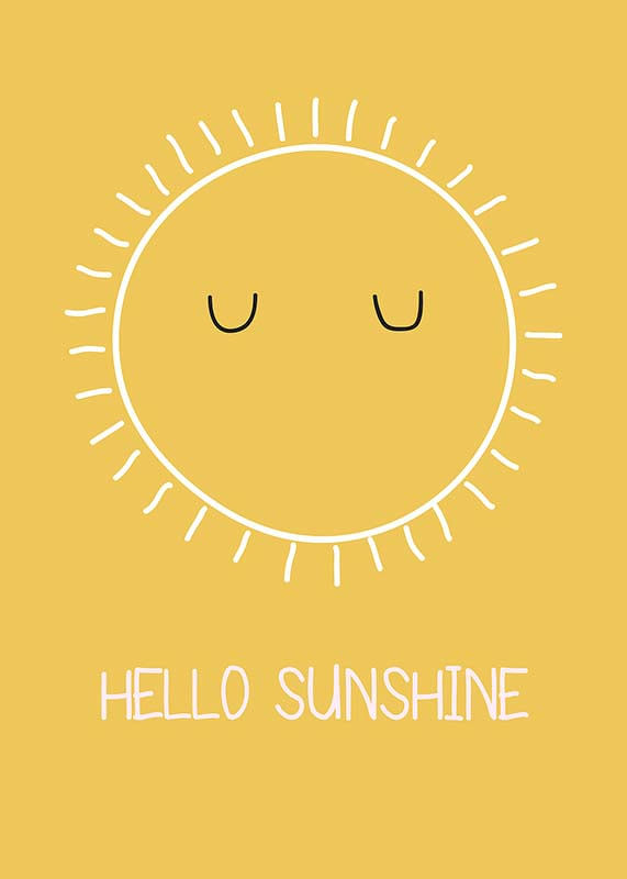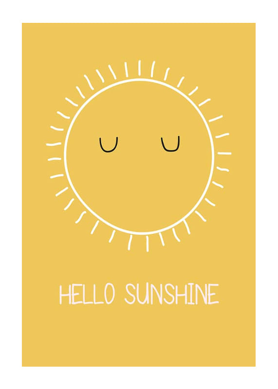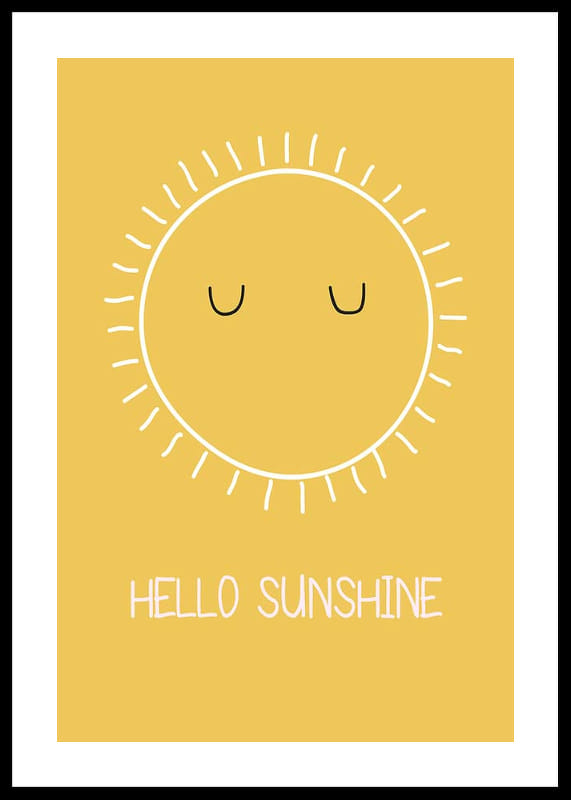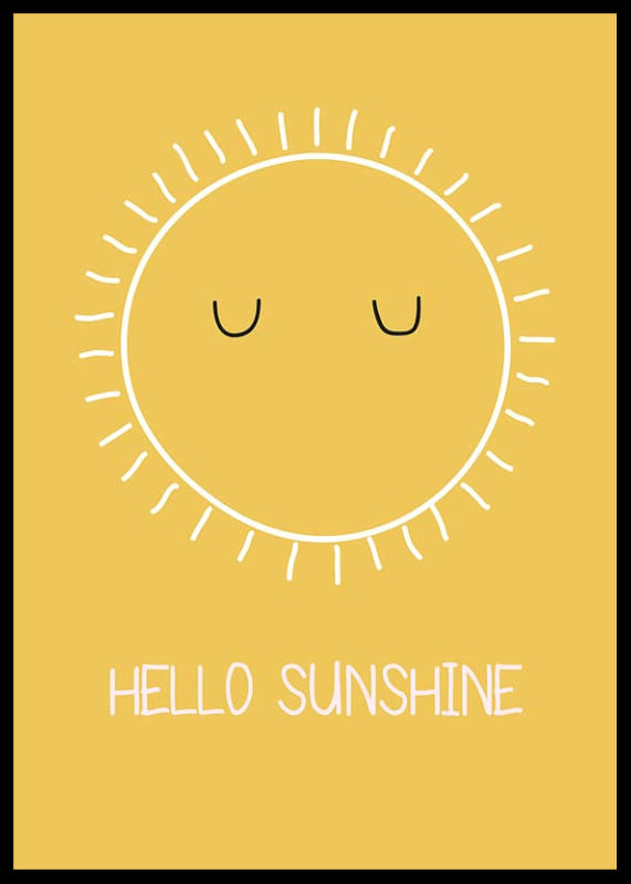 The motif consists of a stylized sun with closed eyes, drawn with soft white lines against a warm yellow background. Under the sun is the text 'HELLO SUNSHINE' in a playful font. This poster is particularly suitable for children's rooms where you want to create a happy and inviting feeling, but also works in other bright environments.
