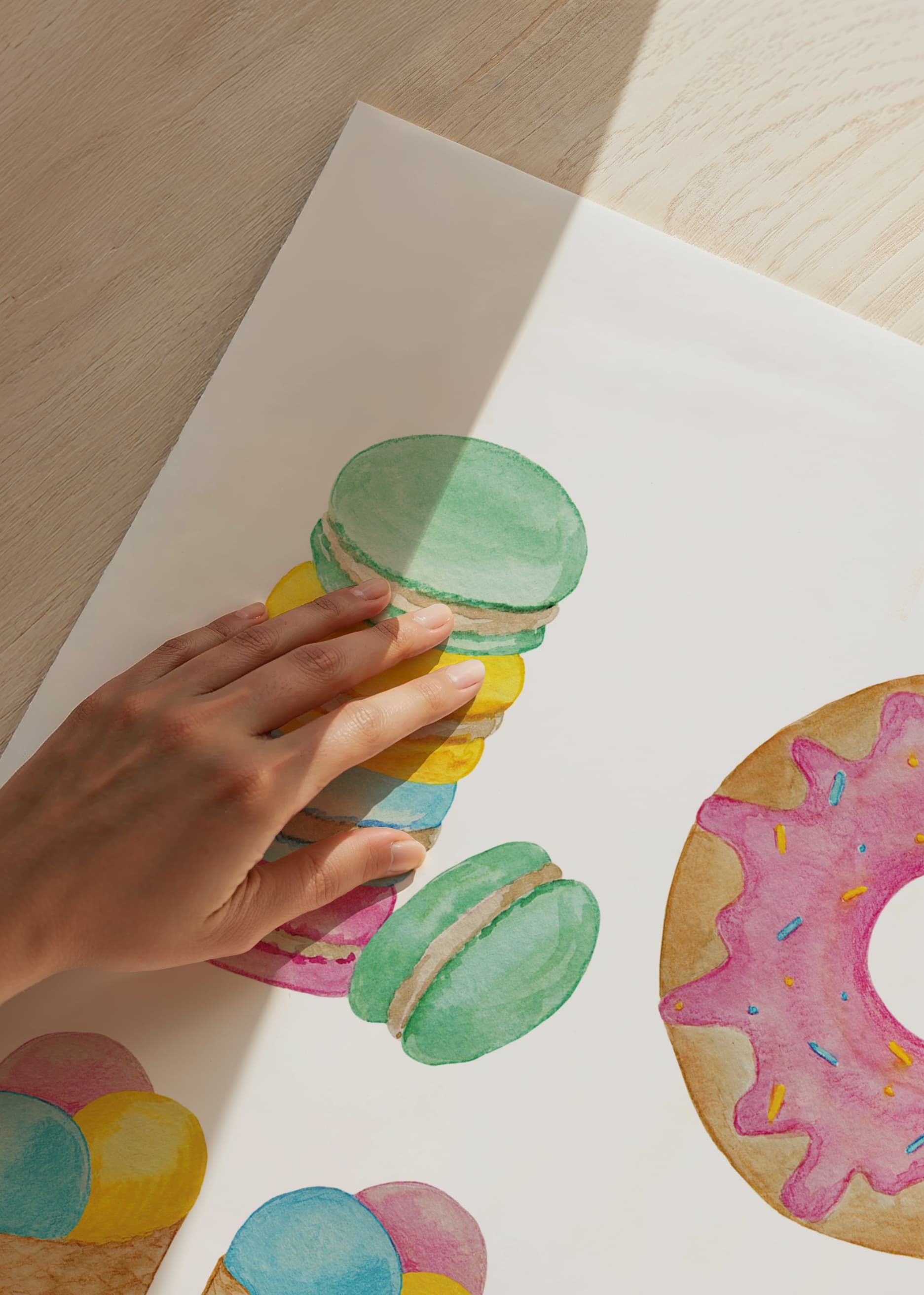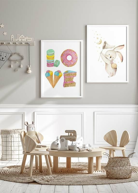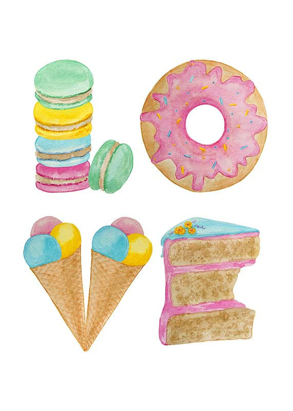 Colorful pastries and sweets form the word LOVE in a playful watercolor motif. Macarons, a glazed donut, ice cream in a waffle and a piece of cake are arranged against a white background. The soft pastel tones give the poster a light and warm feel, great as decoration in a kitchen or children's room where joy is the focus.
