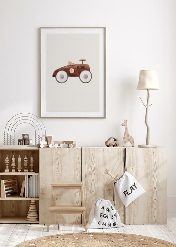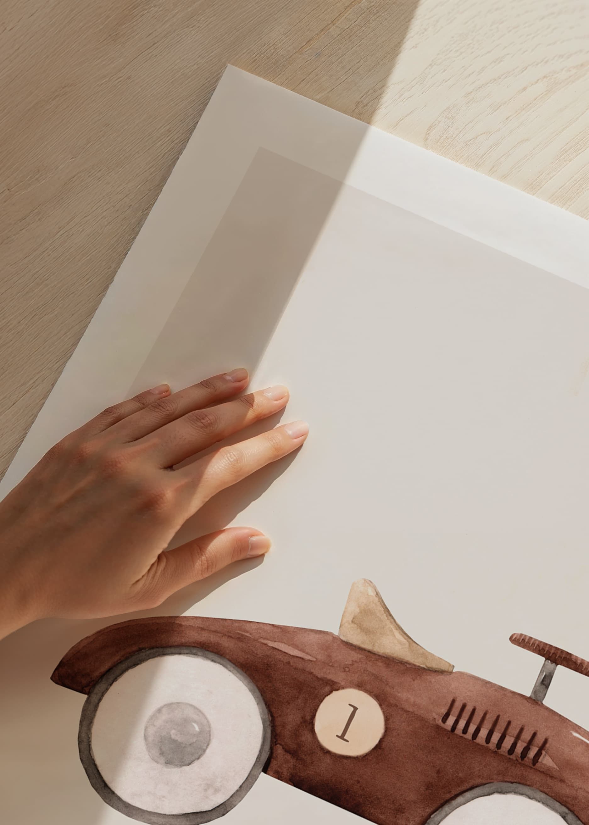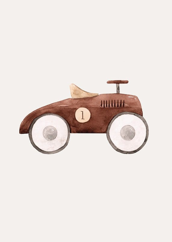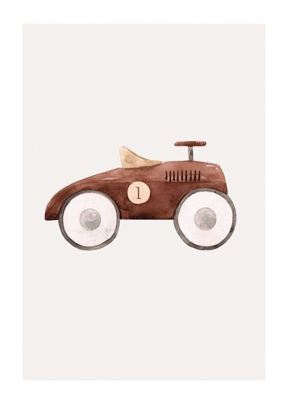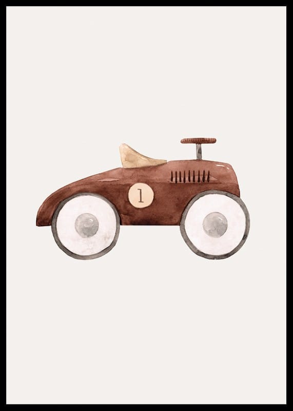 The motif consists of a brown toy car painted in watercolor, placed centrally against a light sand-colored background. Details such as white wheels and a bright number on the side contribute to a playful but understated feel. This poster adds a calm and inviting expression to children's rooms or other creative environments.