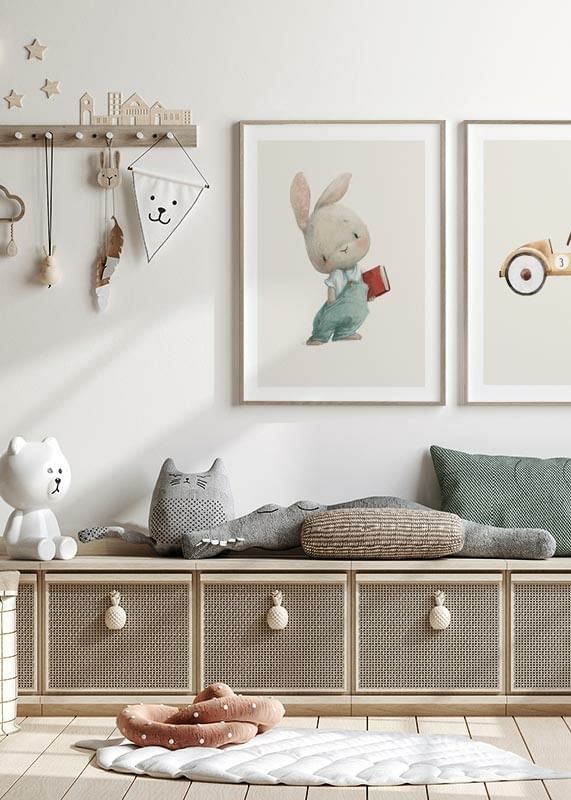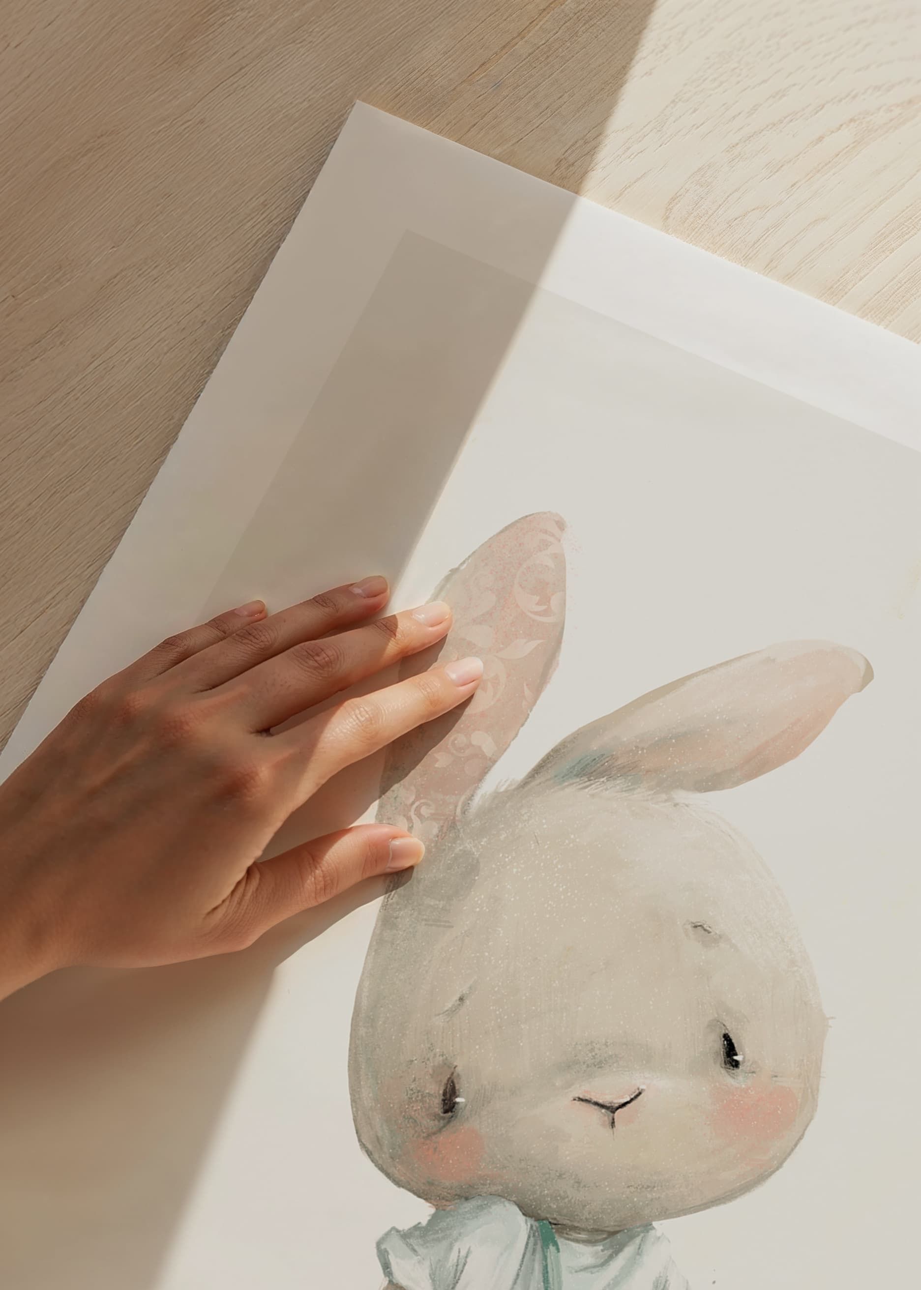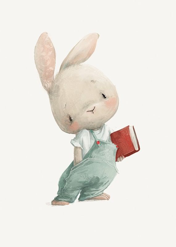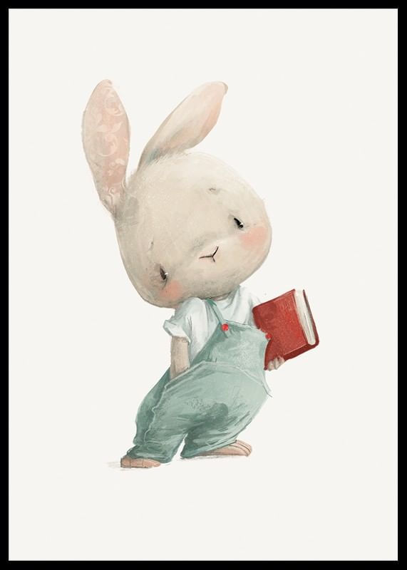 The motif consists of a softly illustrated young hare with big ears, dressed in light blue overalls and a white sweater. The hare is holding a red book against its body and stands against a light beige, solid-colored background. The playful and friendly style makes this poster a nice addition to a child's room or play corner.
