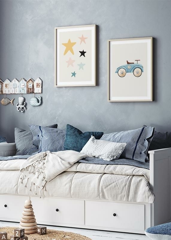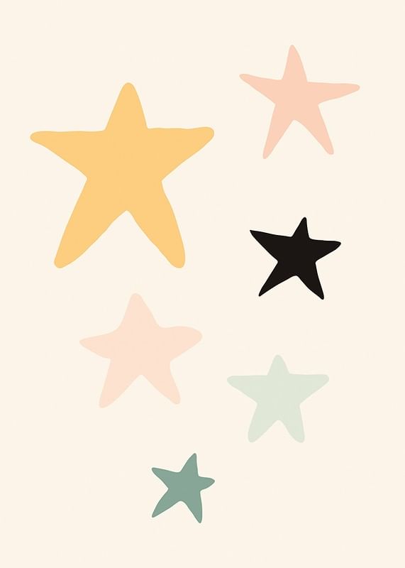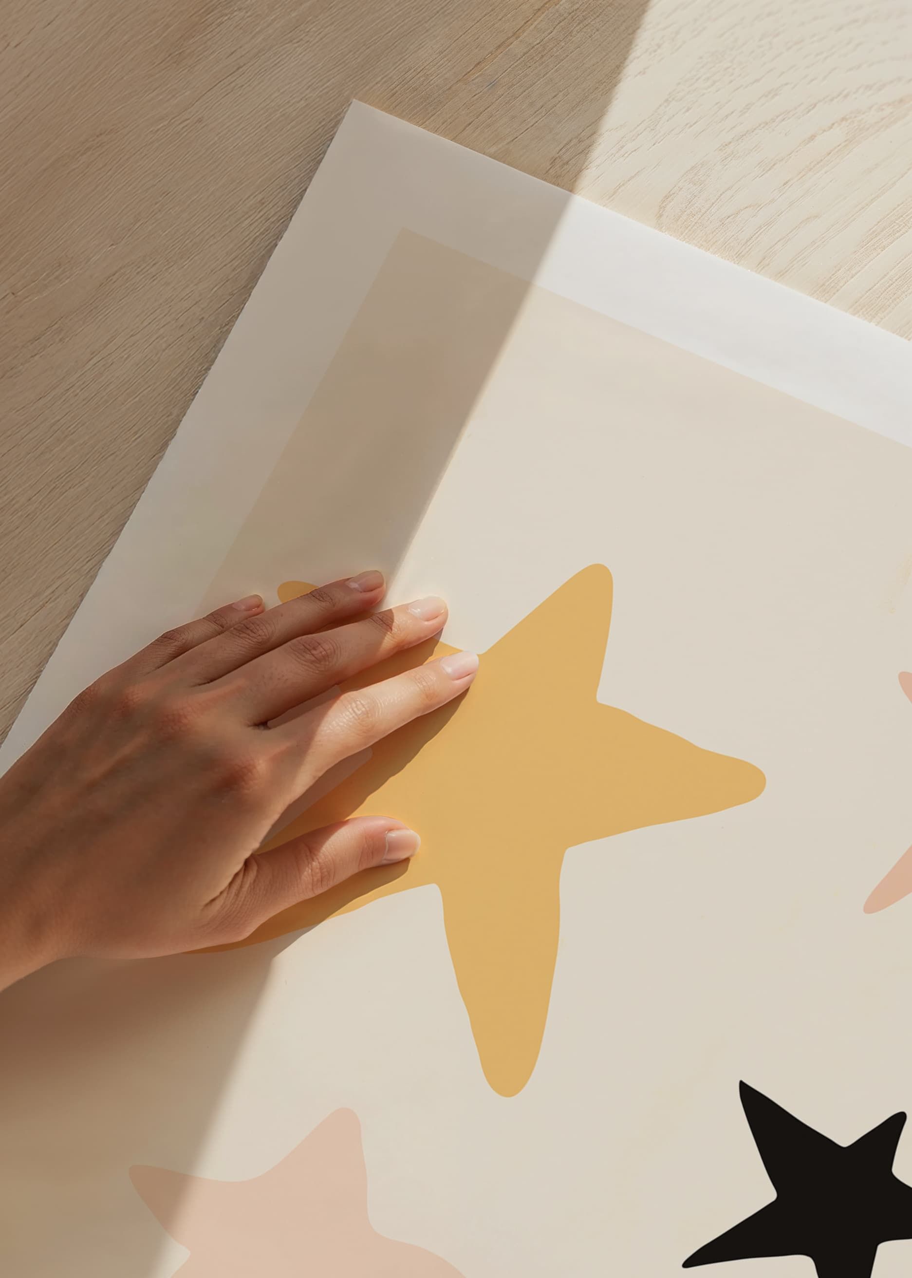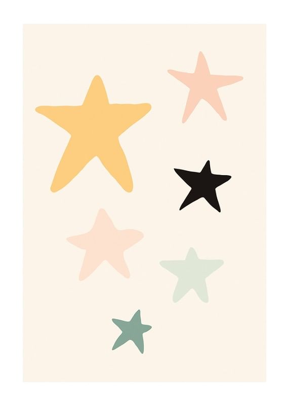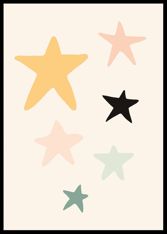 Stars in soft shades of yellow, pink, black, green and mint green are scattered across a light, sand-colored background. This poster has a playful and minimalist expression that is perfect for children's rooms but also in other rooms where a light and modern feel is desired. The colors contribute to a warm atmosphere.