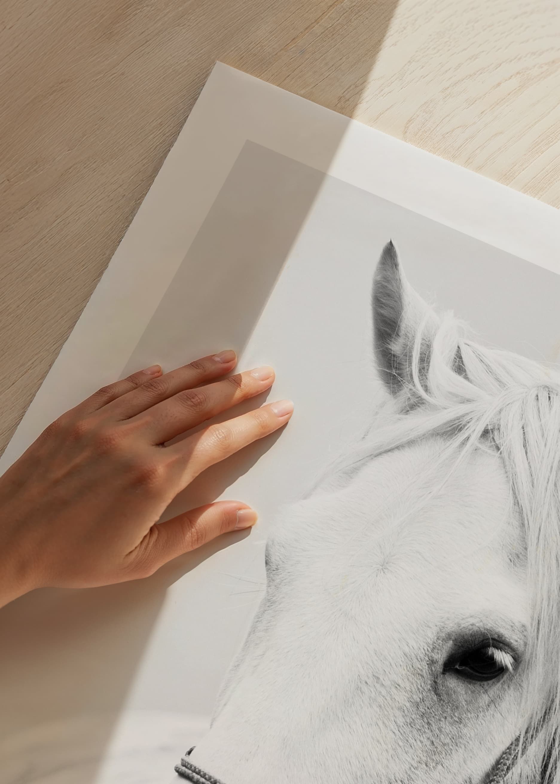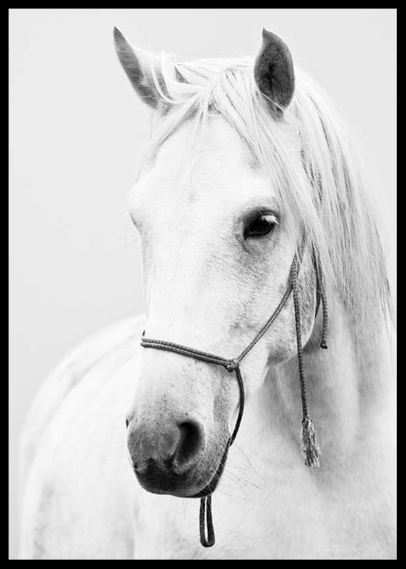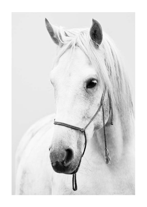 Portrait of a white horse with a long mane and simple halter against a light solid background. The horse's soft features and detailed coat stand out clearly in the black and white color scheme. This poster combines classic animal portraiture with modern simplicity and fits in everything from the living room to the hallway or study.