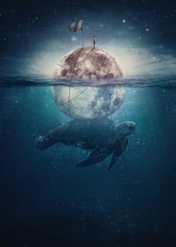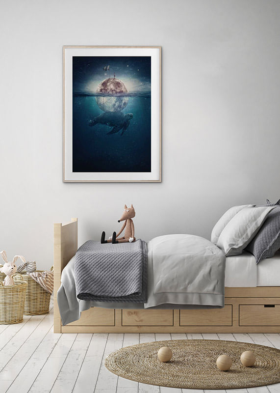 A large sea turtle swims under the water and carries a shining moon, tied to its back. On top of the moon stands a small figure with a flag against a starry night sky. Deep blue and silver tones create an imaginative atmosphere. This poster fits nicely in children's rooms or creative environments.