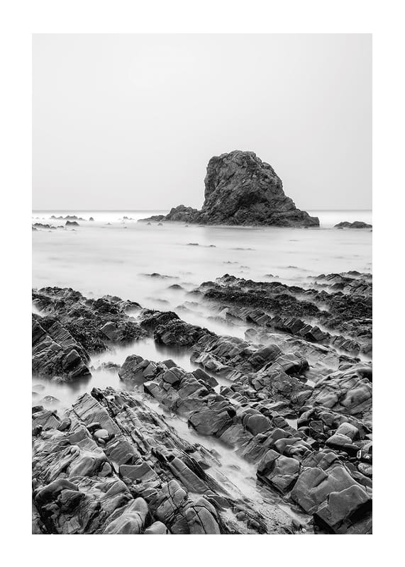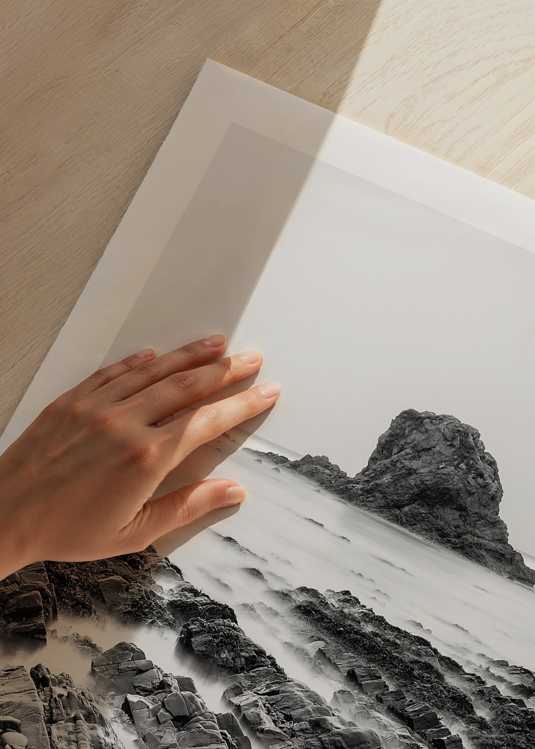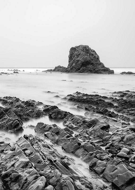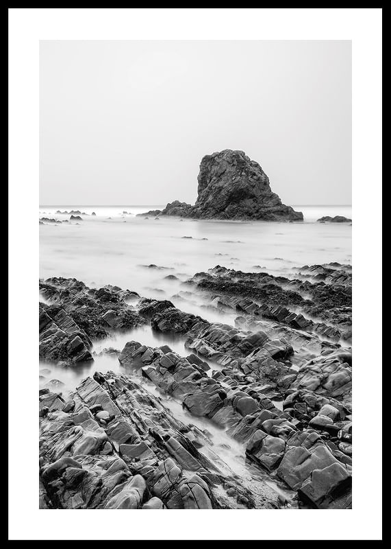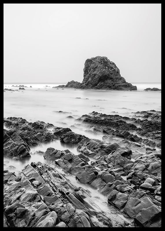 Massive cliffs extend into the sea while a lone boulder rises in the background. Timeless black and white toning enhances the contrast between the sharp rocks and the soft, hazy water. This poster gives a graphic and stylish impression in, for example, a living room or study.