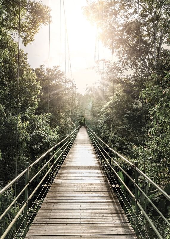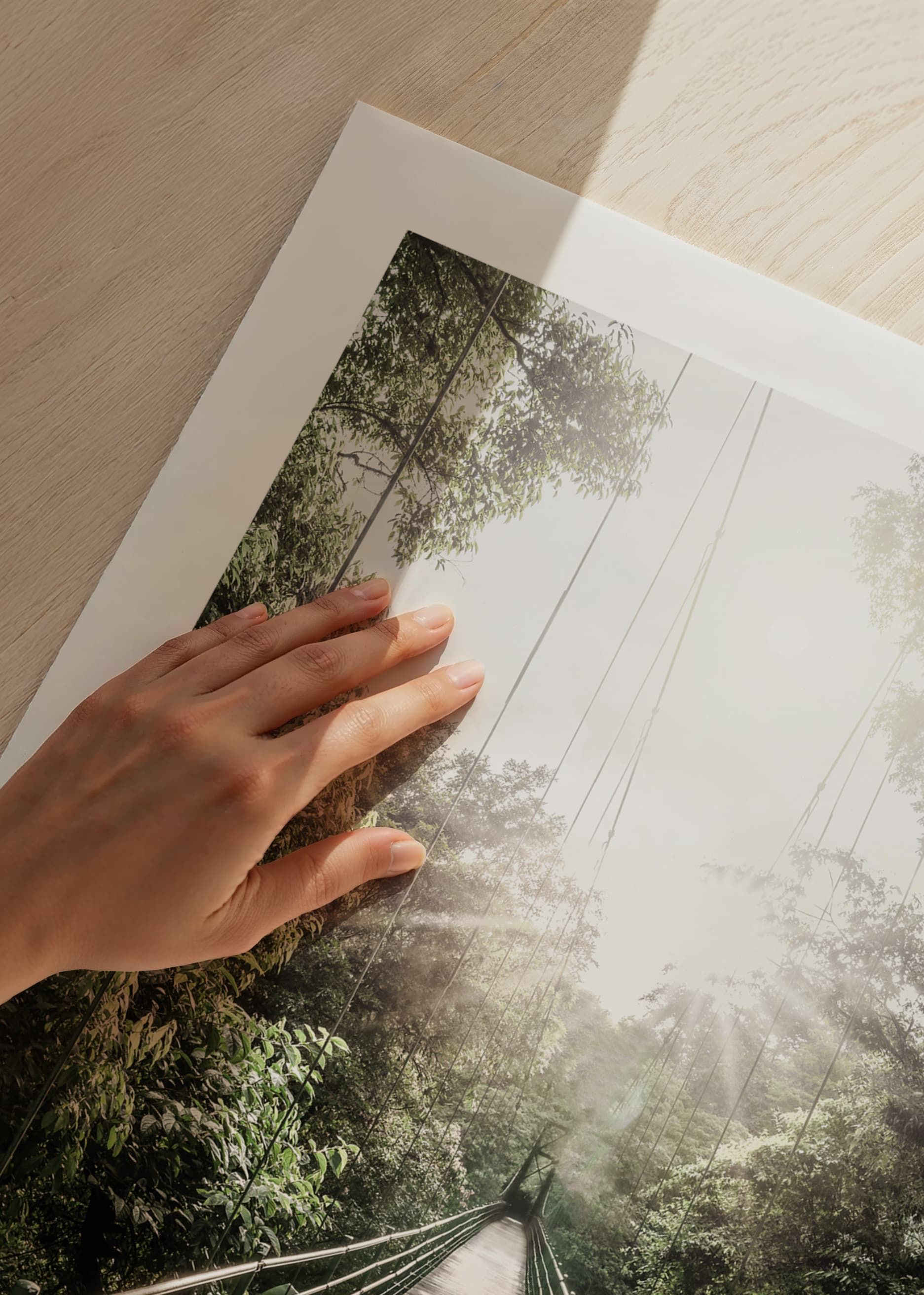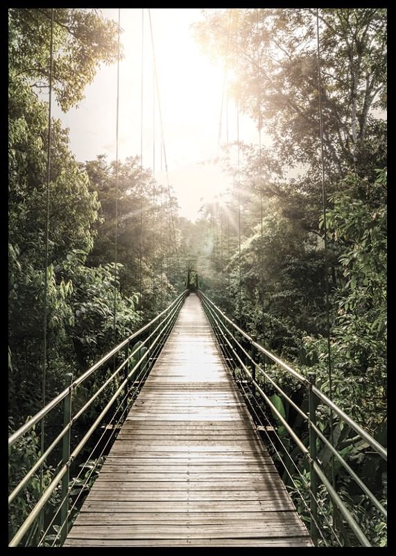 A light wooden bridge stretches straight into a lush rainforest with dense trees and sun rays filtering through the foliage. The lush vegetation of the jungle surrounds the entire motif and gives an impression of depth. This poster is suitable for both living rooms and hallways where the presence of nature can take place.
