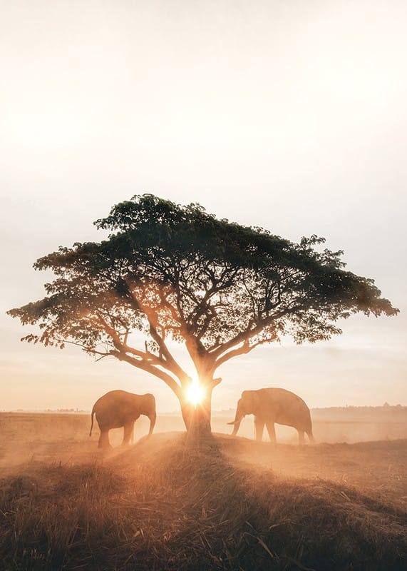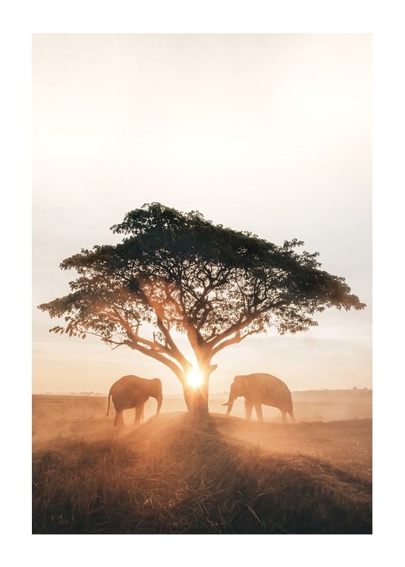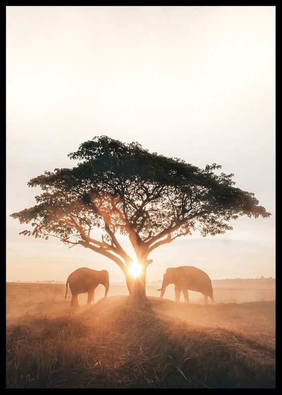 Two elephants stand on either side of a lone tree on an open savannah, enveloped in golden morning light and mist. The sun rises just behind the tree trunk, creating soft shadows across the dry grass. This poster conveys a peaceful African landscape and is suitable for rooms where a sense of nature and warmth are appreciated.