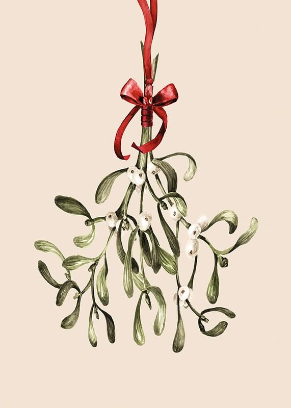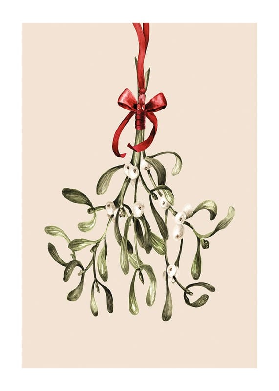 The motif consists of a hand-painted mistletoe sprig with green leaves and white berries, suspended from a red silk ribbon and bow against a sand-colored background. The soft natural colors and simple shape give a calm, wintry feel. This poster adds a seasonal touch to your living room, hallway or kitchen during Christmas.