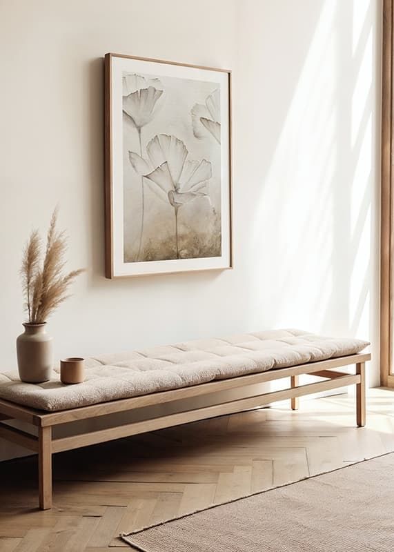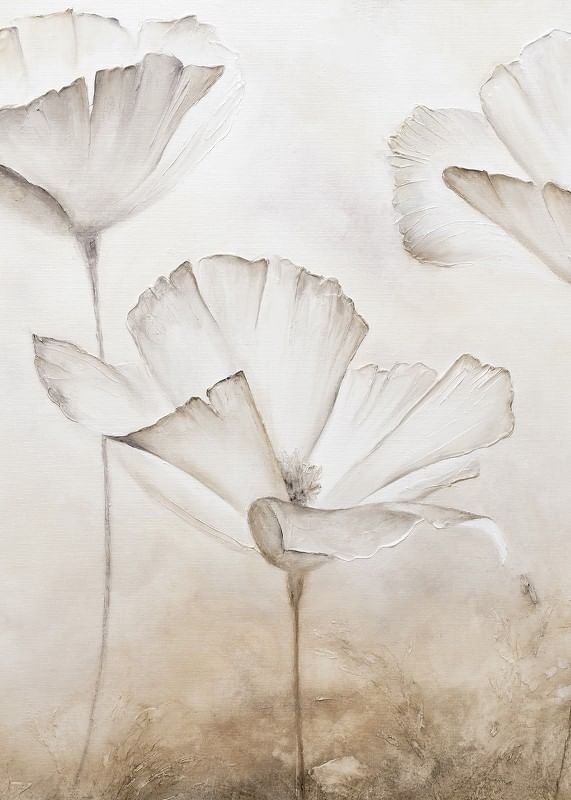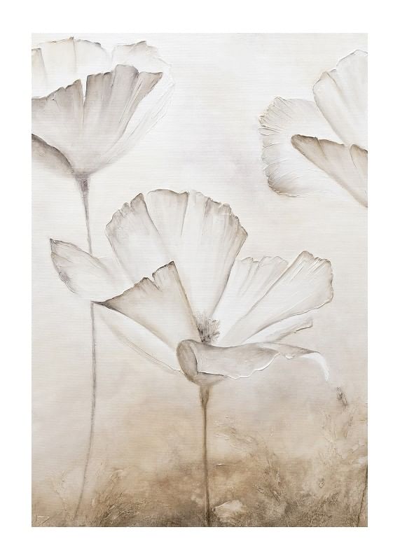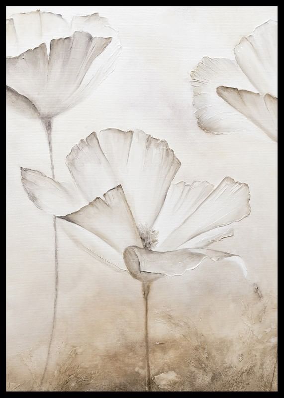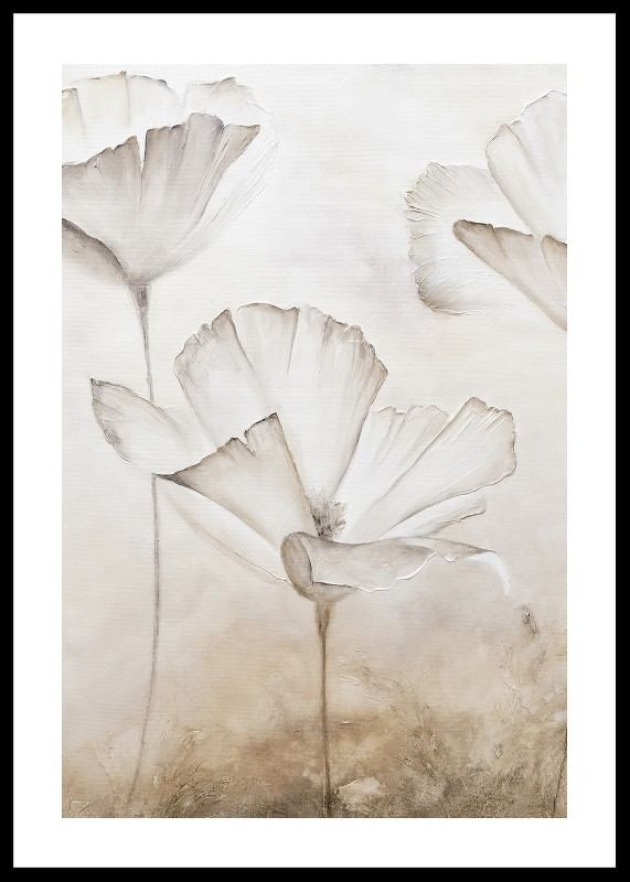 Large white flowers with thin, faintly marked leaves appear against a softly textured background in beige and sand tones. The motif has a watercolor feel with airy shapes and discreet details. This poster gives a calm, natural expression that is suitable for both living rooms, bedrooms or hallways.