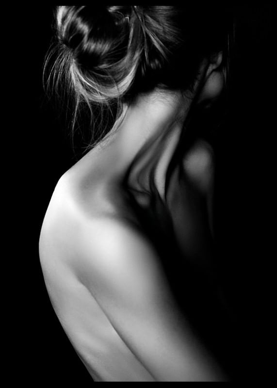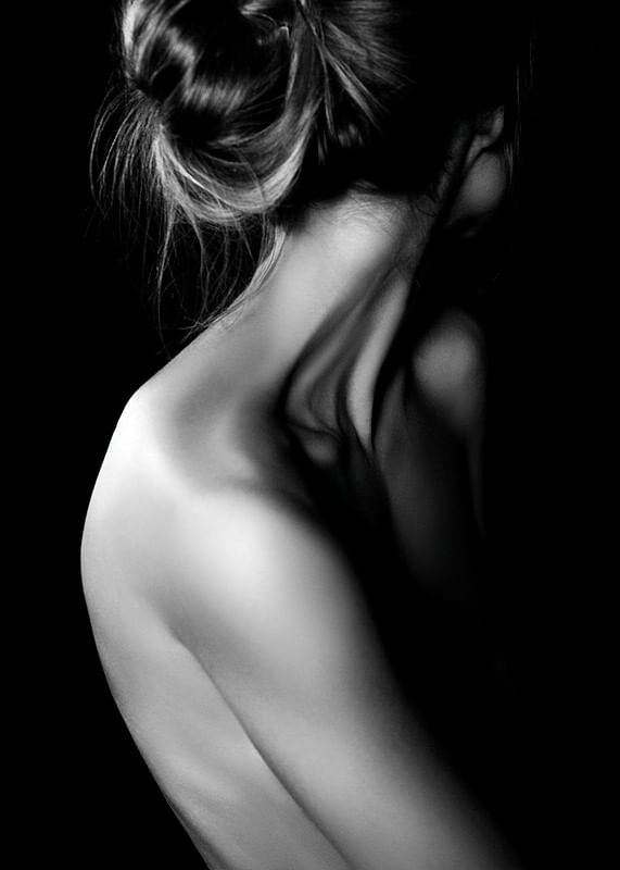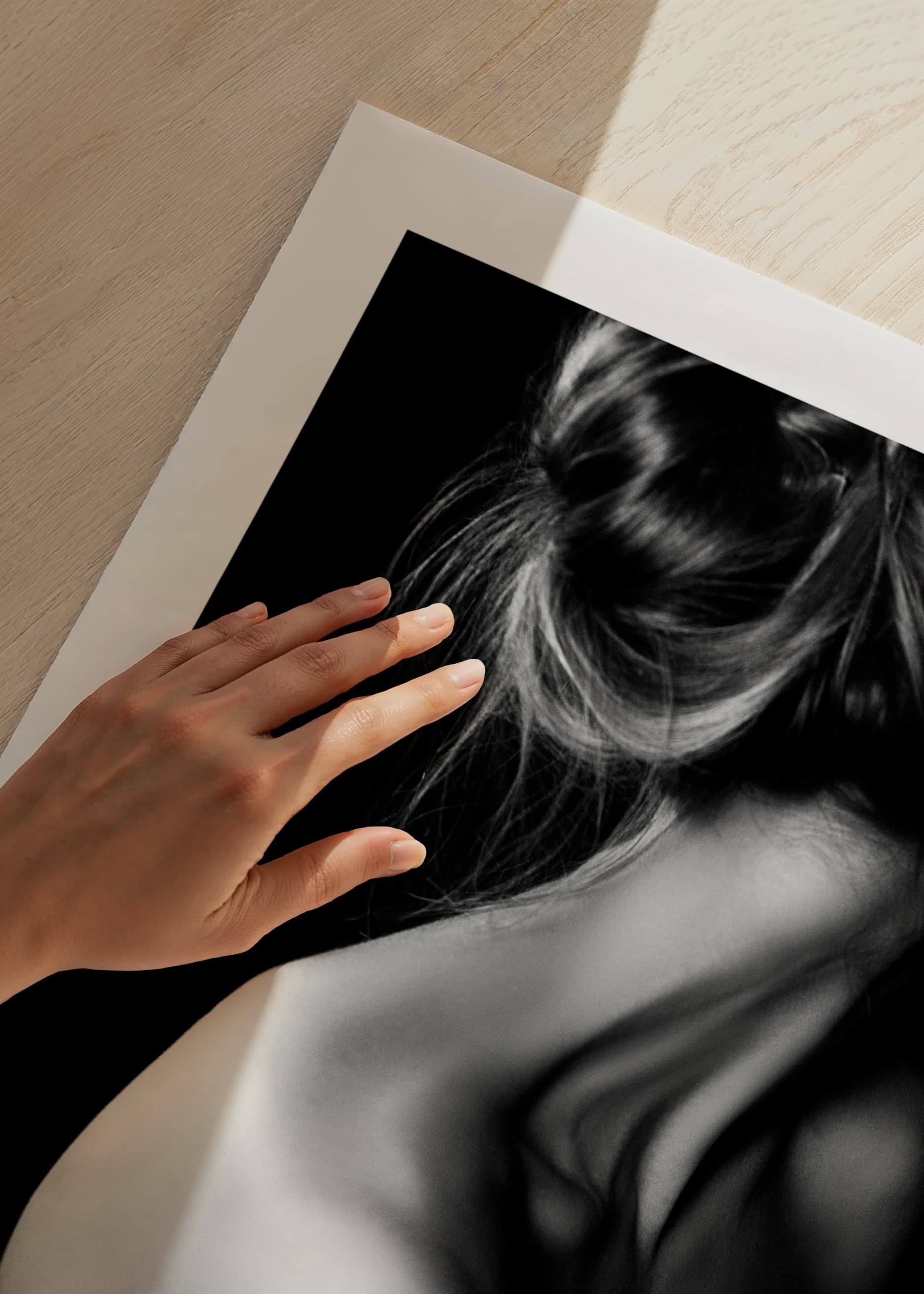 Silhouette of a woman with her hair up and her face turned away, drawn against a dark background. The light highlights the lines of the neck and shoulders in a black and white composition. The motif has a stylish and understated expression, and the poster contributes a modern feel to, for example, a bedroom or living room.