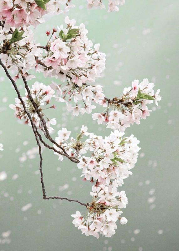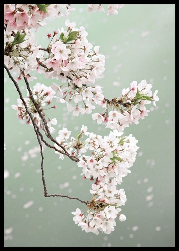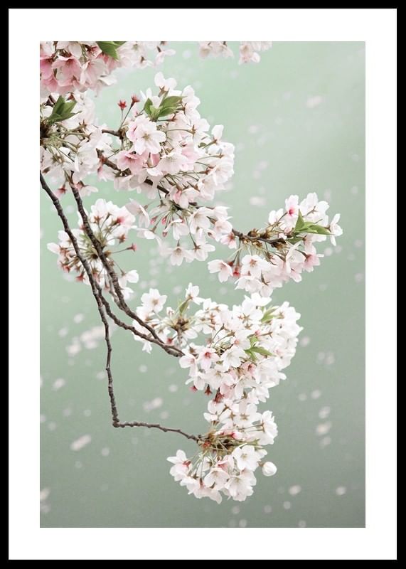 Cherry tree branches are covered in pale pink flowers and small green leaves, captured in a photographic close-up against a softly blurred green background. Falling flower petals contribute to a spring feeling to the motif. This poster fits nicely in homes in need of a fresh, seasonal detail in the living room, bedroom or hallway.