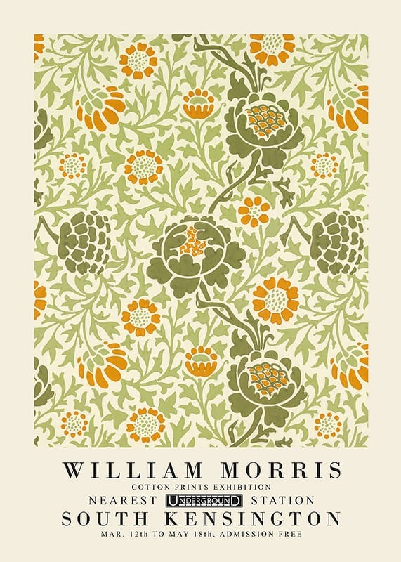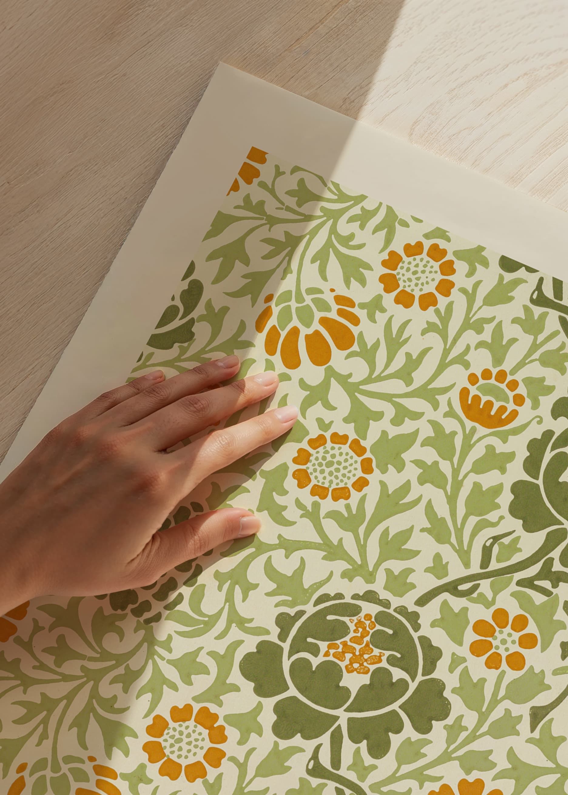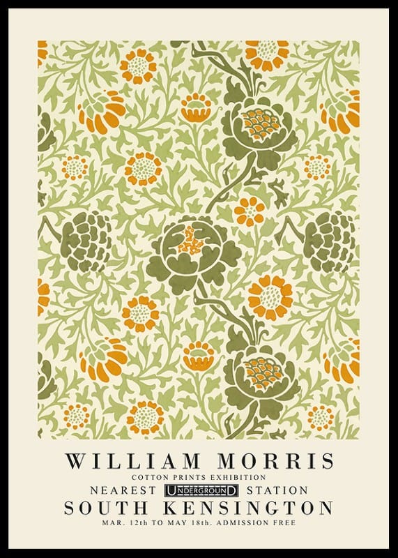 The motif consists of a dense, stylized floral pattern in green and orange shades, typical of William Morris's design language. Irregular flowers and leaves meander across a light background, with harmonious shapes and a classic feel. This poster provides timeless decor for, for example, the living room or dining area. Created by the British designer and artist William Morris, one of the most influential figures in the Arts & Crafts movement and decorative arts.