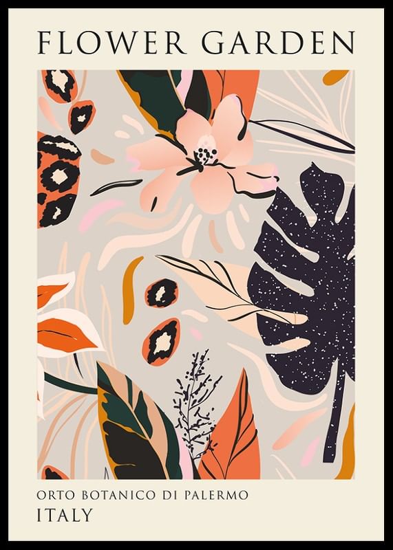 Flowers and leaves in soft tones of orange, pink, beige and black are arranged in a playful pattern against a light background. Graphic shapes and stylized plant details give the motif a modern, artistic touch. This poster is suitable for living rooms, hallways or home offices where color and life are desired.