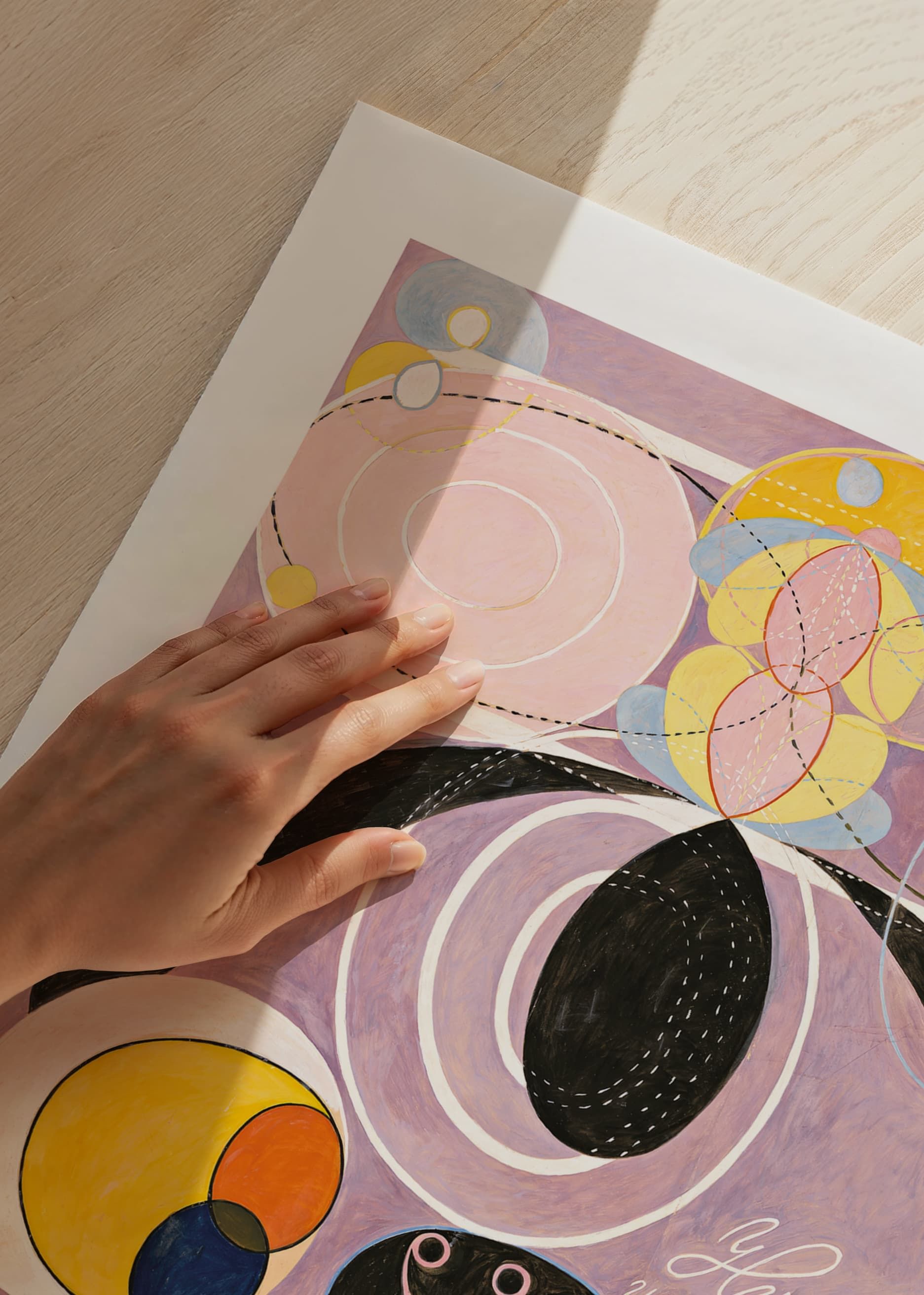 The Ten Largest No6 was painted by Swedish artist Hilma af Klint in 1907. Organic and geometric shapes in soft pastel tones spread out against a purple background, combined with bright lines and decorative spirals. Some touches of black, yellow and orange create contrast in the motif.