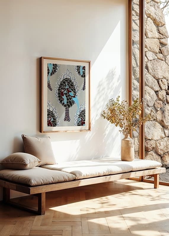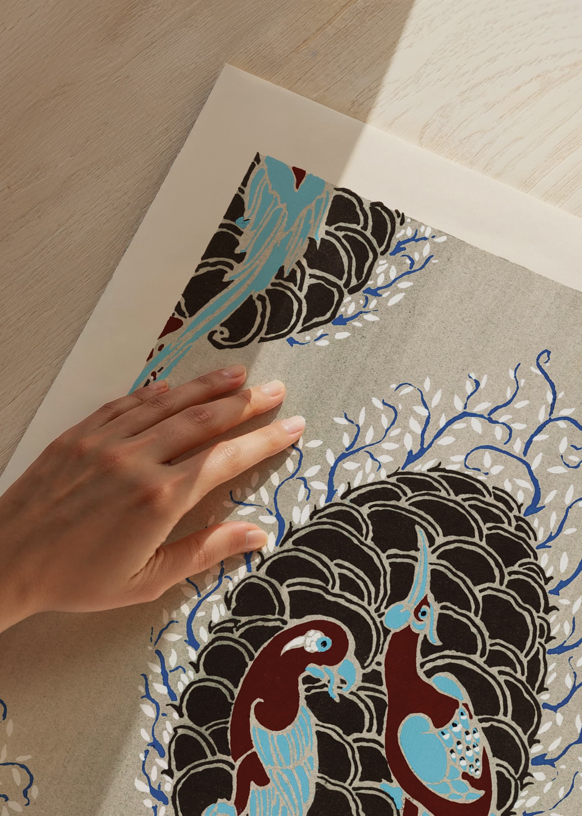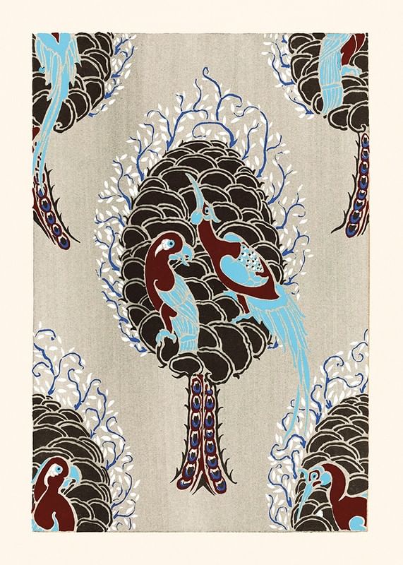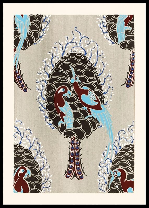 The motif consists of decorative birds in blue, brown and white that sit against large, patterned shapes on a beige background. E. A. Seguy combines symmetry and art deco-inspired lines in his unique style. This poster adds both color and elegance to, for example, a living room or hallway.