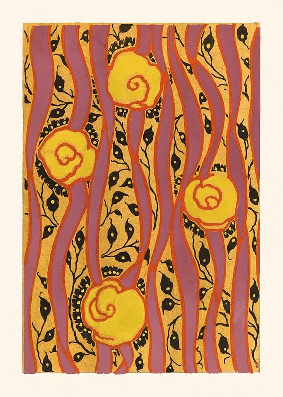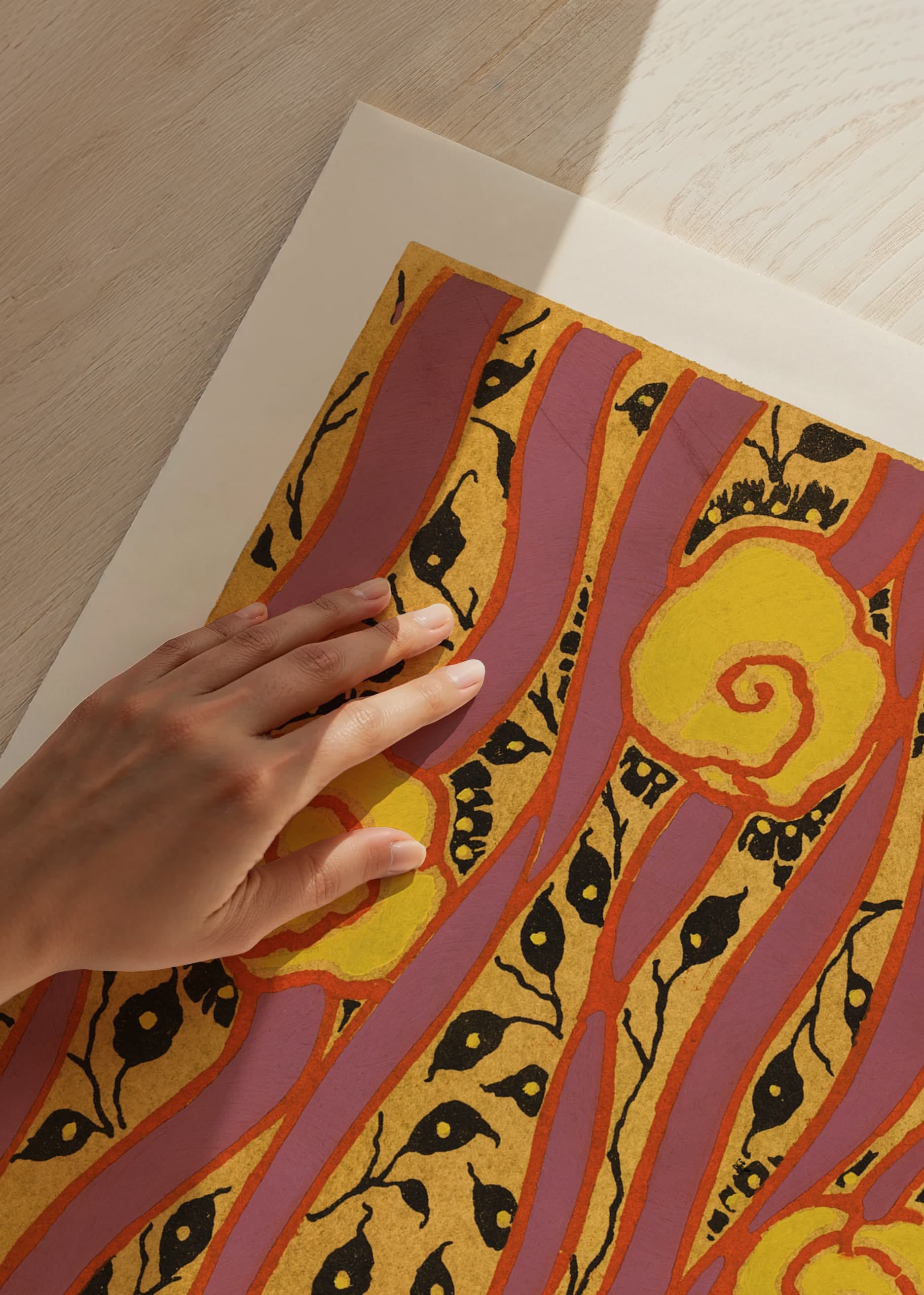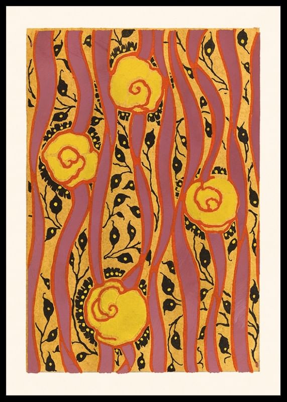 The motif consists of four spiral-shaped yellow flowers against a background of undulating purple and orange lines, interspersed with small black leaves and buds. E. A. Seguy's design gives the poster a distinct Art Deco character. The color scheme fits well as a detail in both modern and classic interiors.