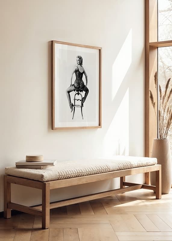 Poster with a black and white photograph of Marinlyn Monroe from 1954 where Monroe is sitting on a stool during a photo shoot. The photo has an old and grainy structure that gives the image a contemporary vintage look. This vintage photograph of Marilyn Monroe belongs to our collection of iconic photographs of celebrities.