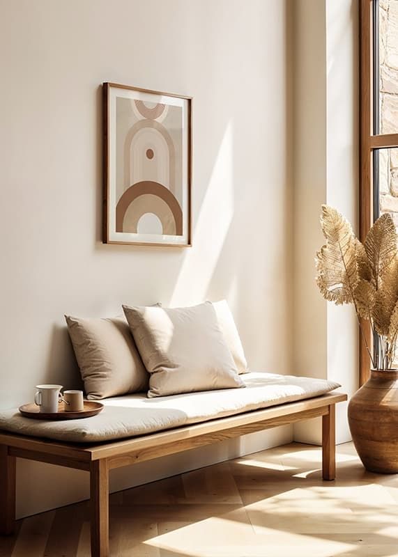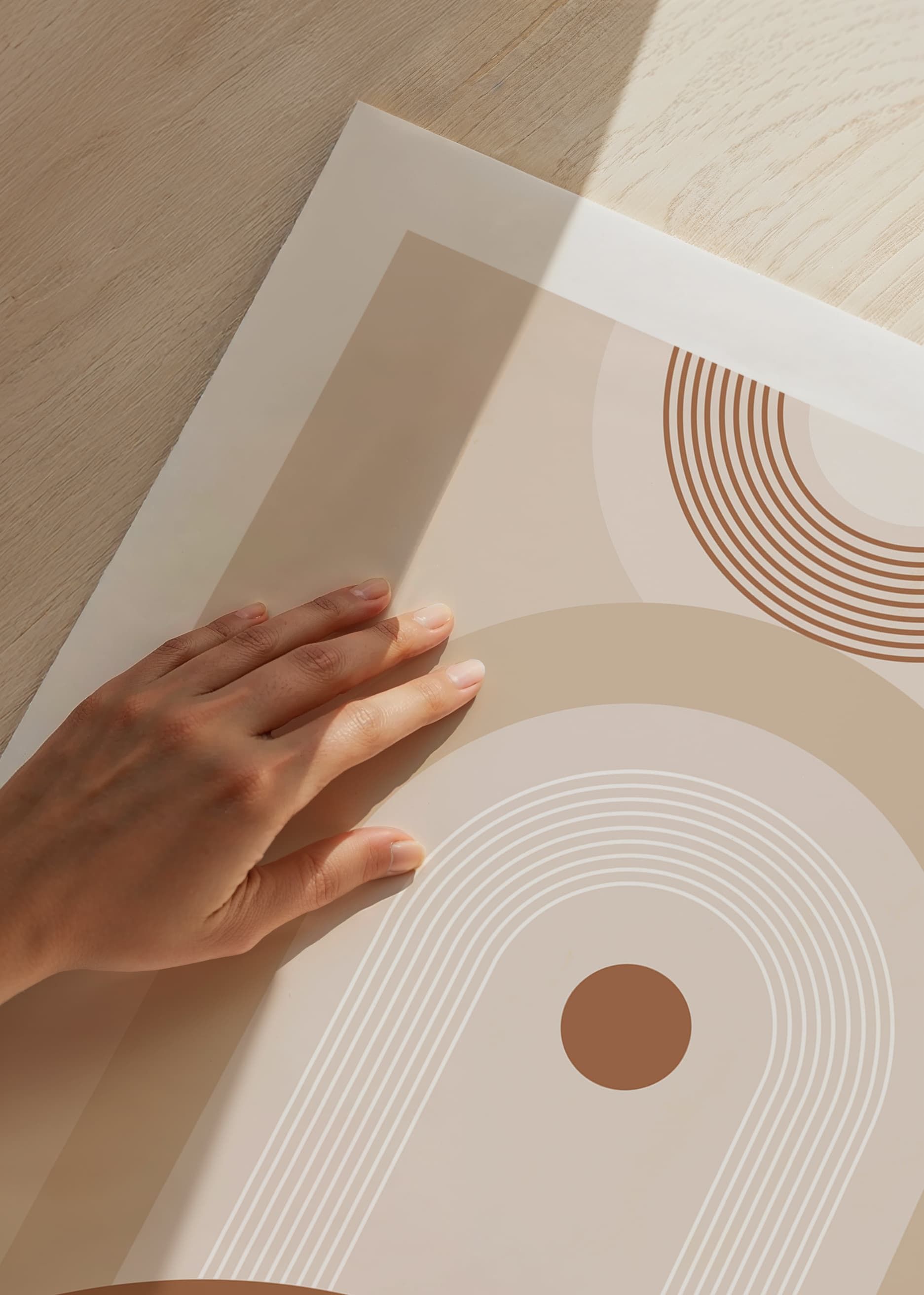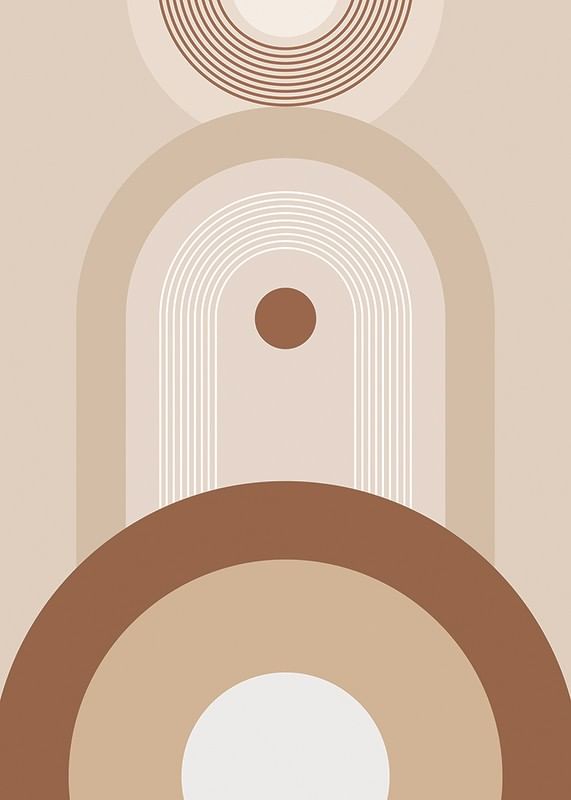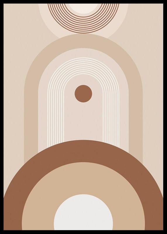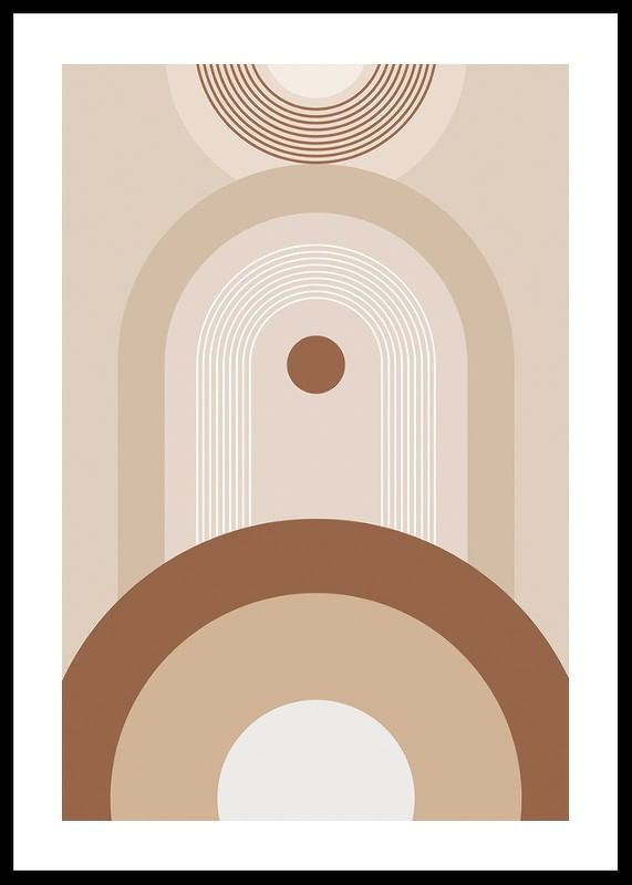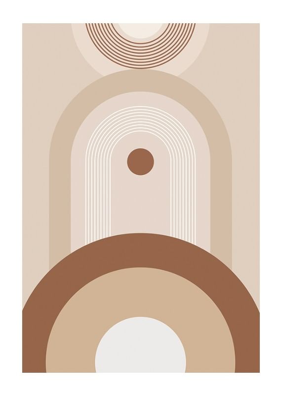 The pattern consists of arc-shaped lines, circles and hemispheres in different shades of beige and brown. A modern, graphic poster where the contrast between the soft shapes and the clean lines creates a balanced expression. Fits nicely as an interior detail in the living room, hallway or home office where a stylish feel is desired.