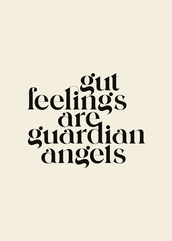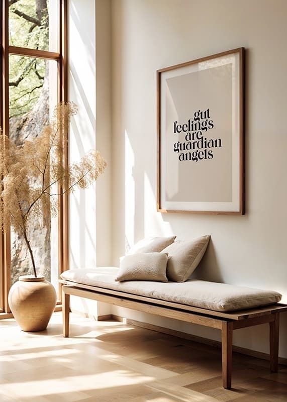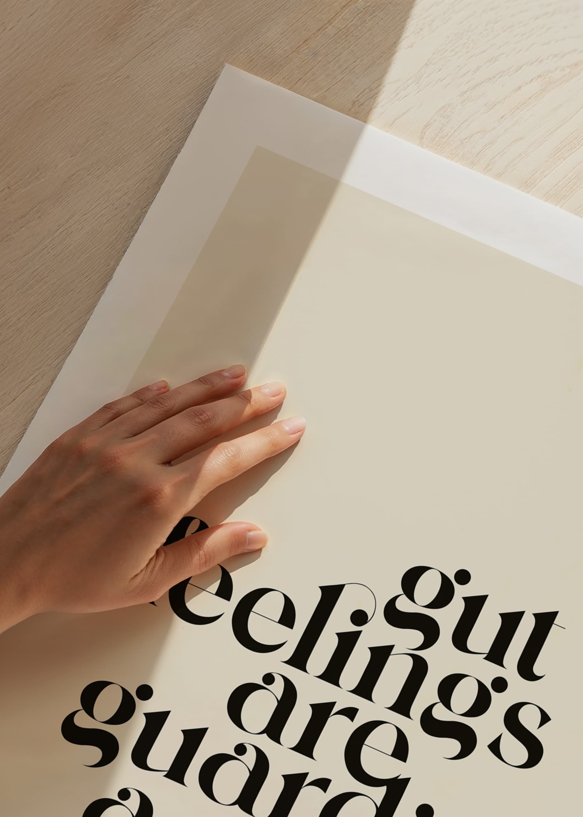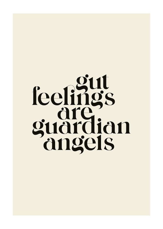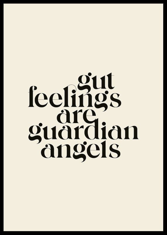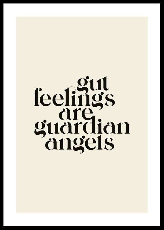 The statement text "gut feelings are guardian angels" is in black, stylish serif style against a soft, light beige background. The motif's central placement and airy composition give a modern impression. Posters with a clear message that fit just as well in the hallway as above the desk and elevate rooms with personal character.
