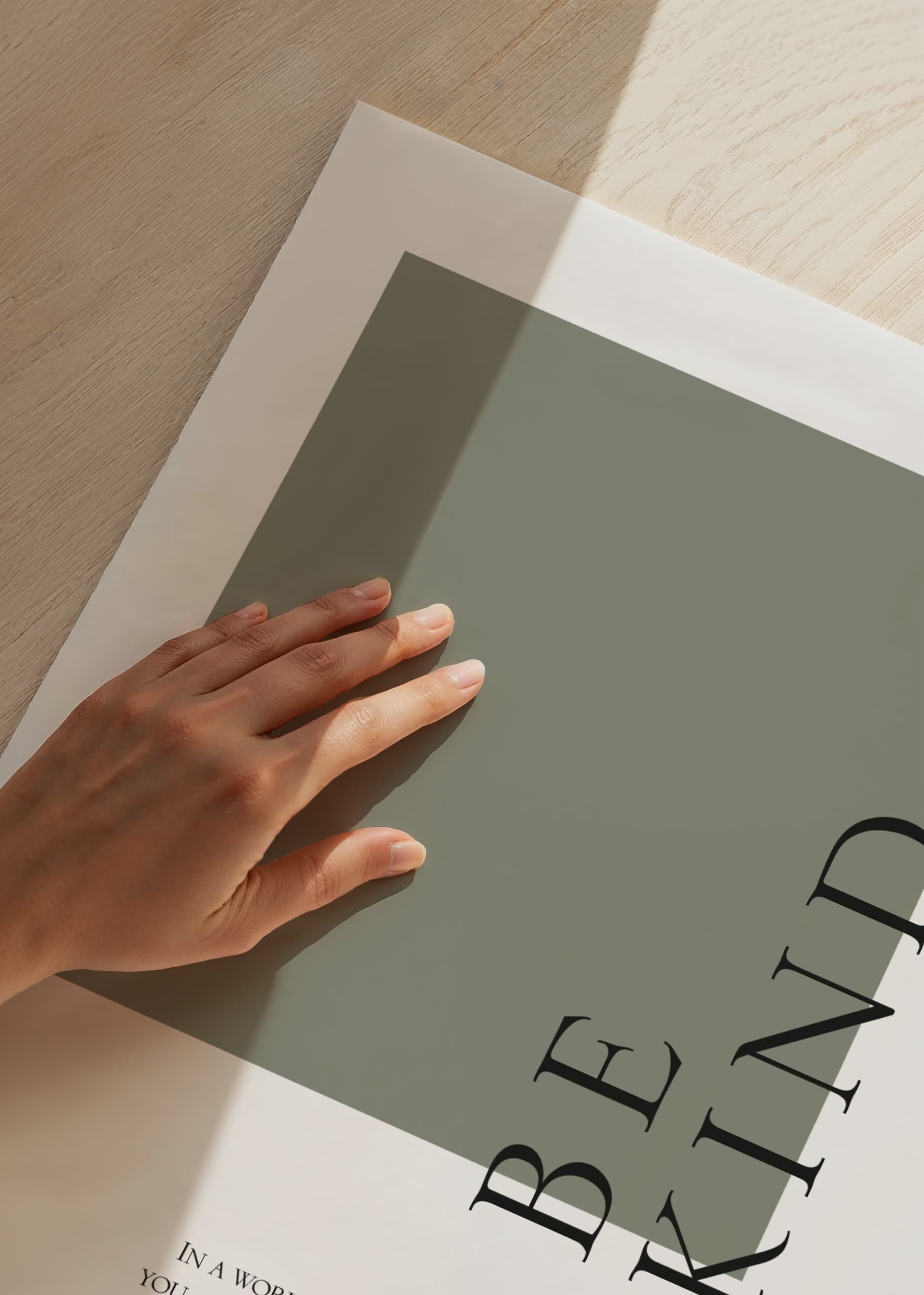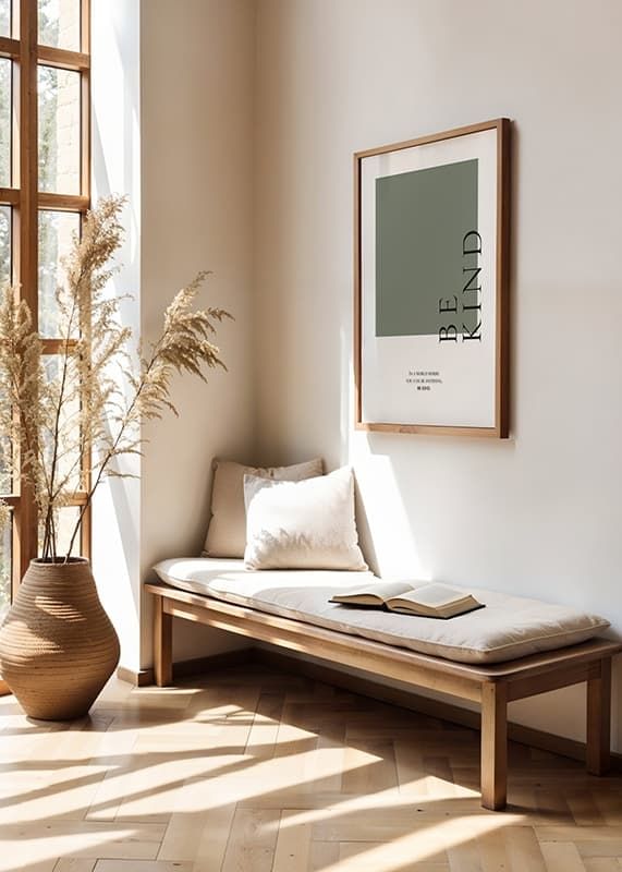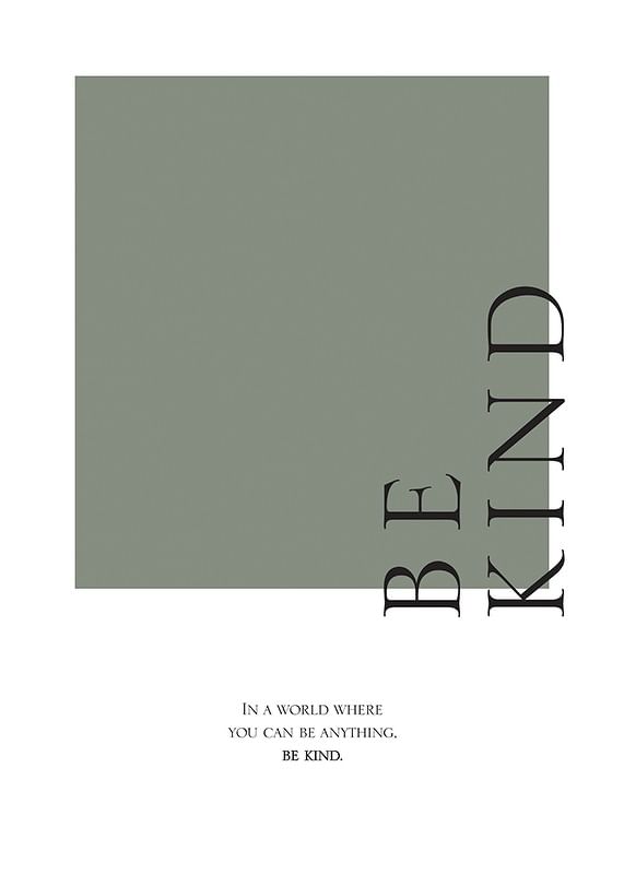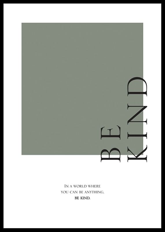 Stylish text motif with the words 'Be Kind' in large black capital letters vertically above a muted green square. Below the motif is the text 'In a world where you can be anything. Be kind.' in smaller characters. The minimalist design and soft color scheme make the poster easy to combine in both the hallway, office and living room.