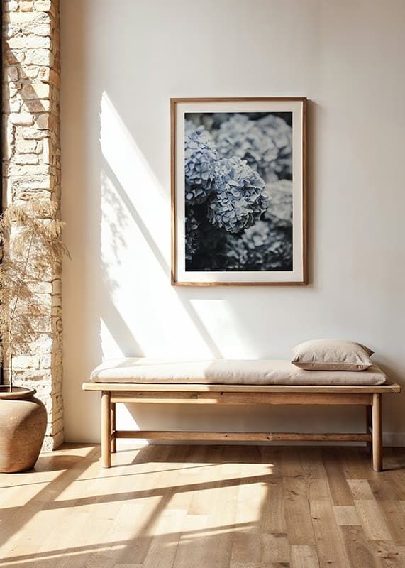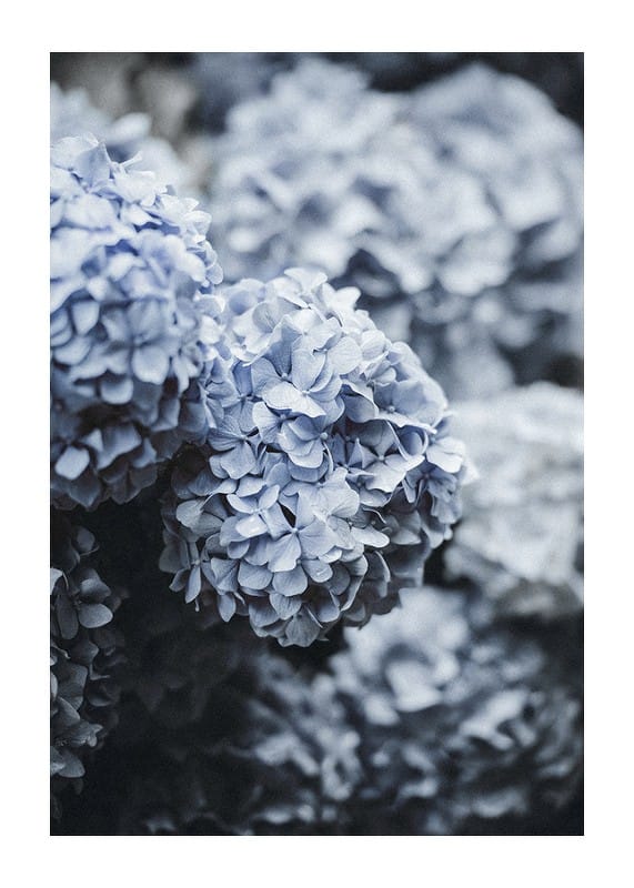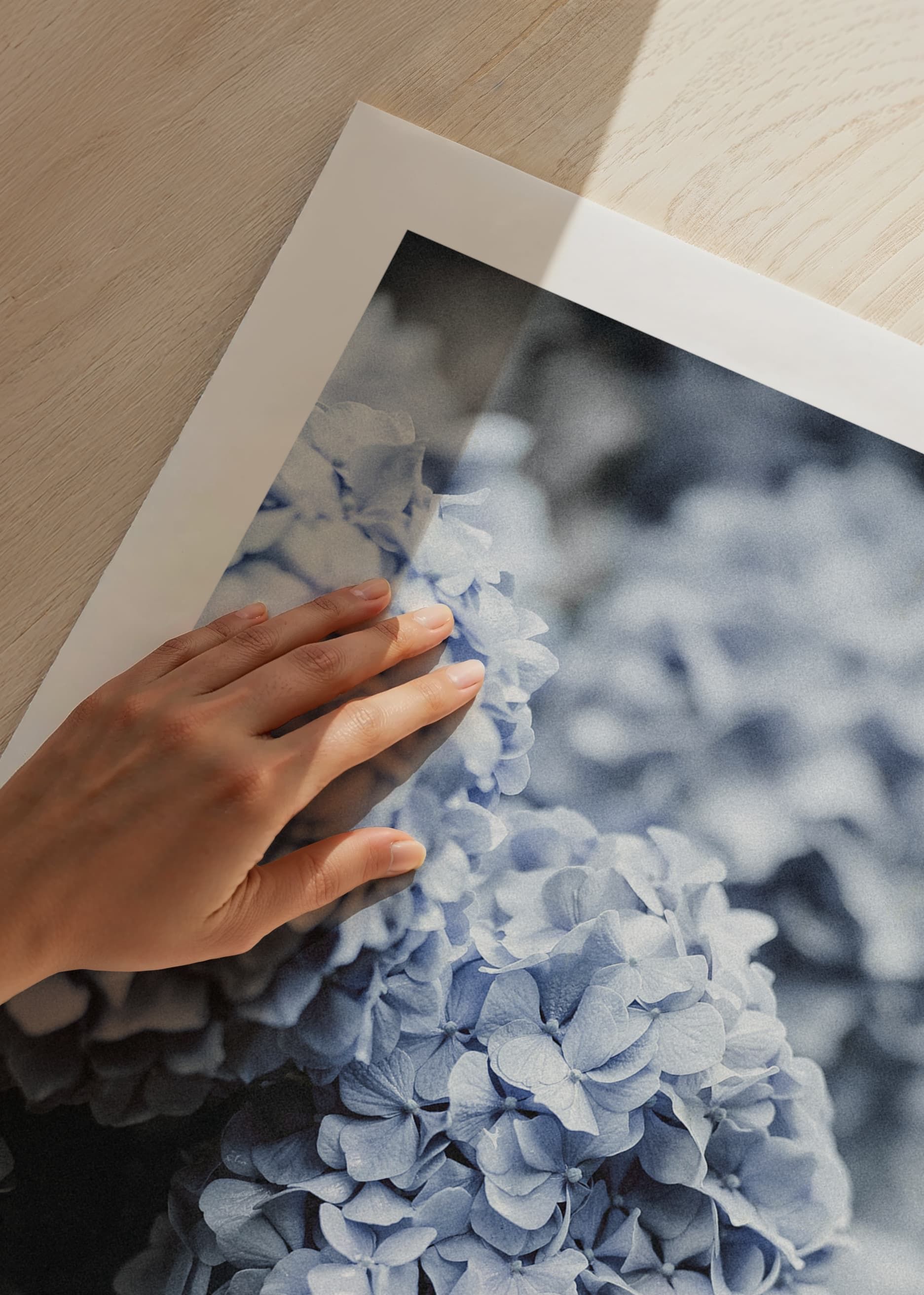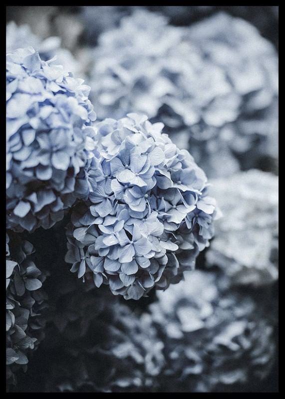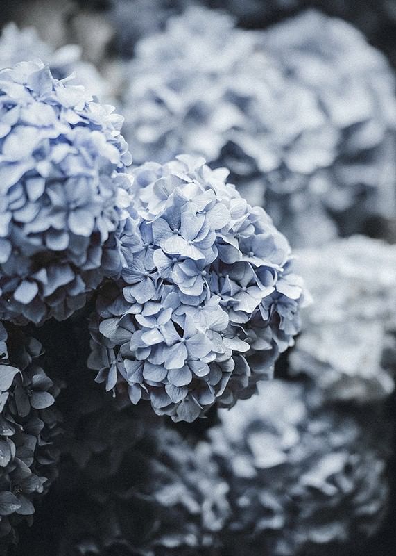Close-up of blue hydrangea flowers where the dense clusters of flowers stand out clearly against a soft, slightly blurred background. The cool blue shades give a calm and natural impression. The details and shape of the flowers give a botanical feel to the room. The poster fits well in the living room, bedroom and hallway.