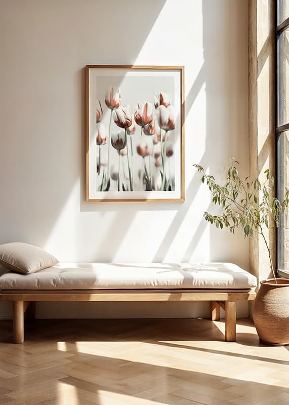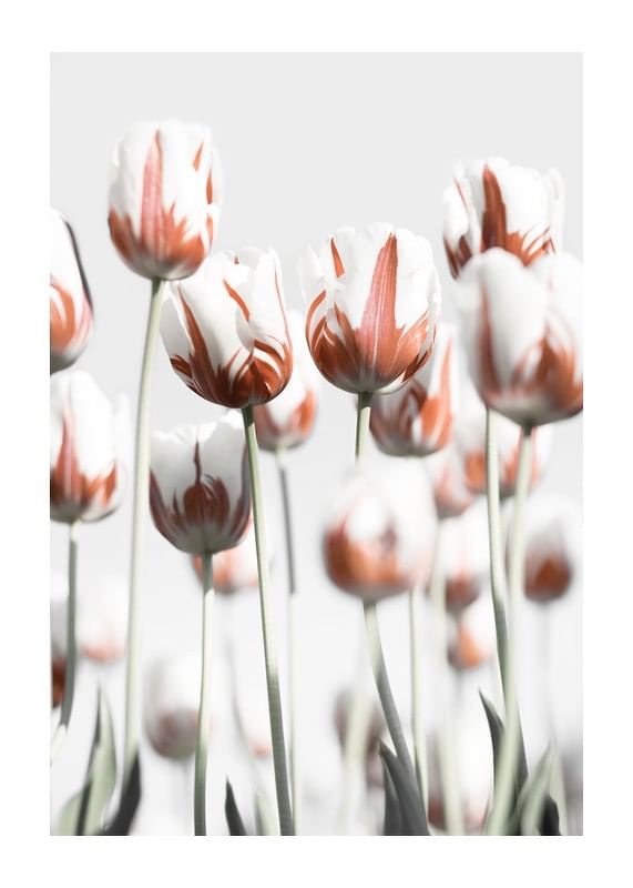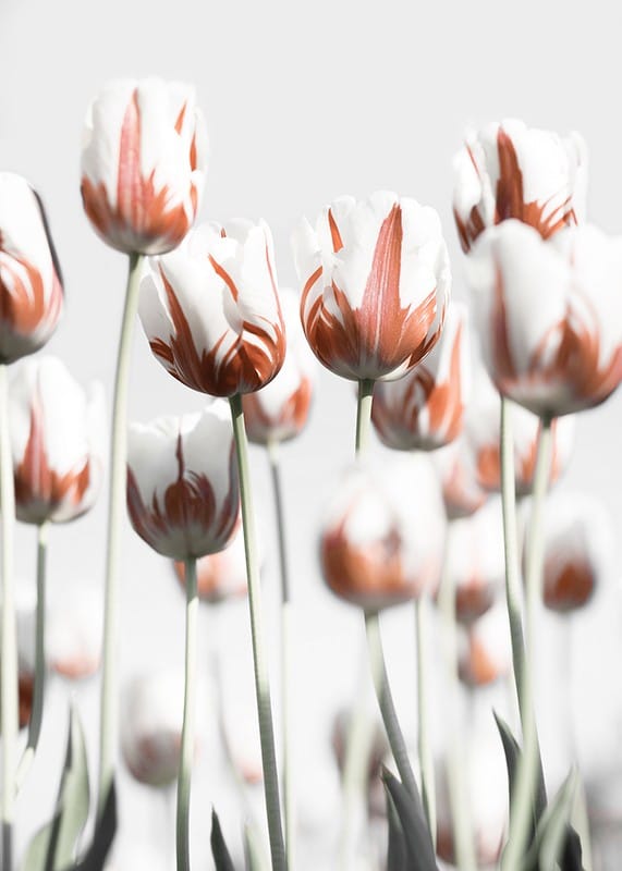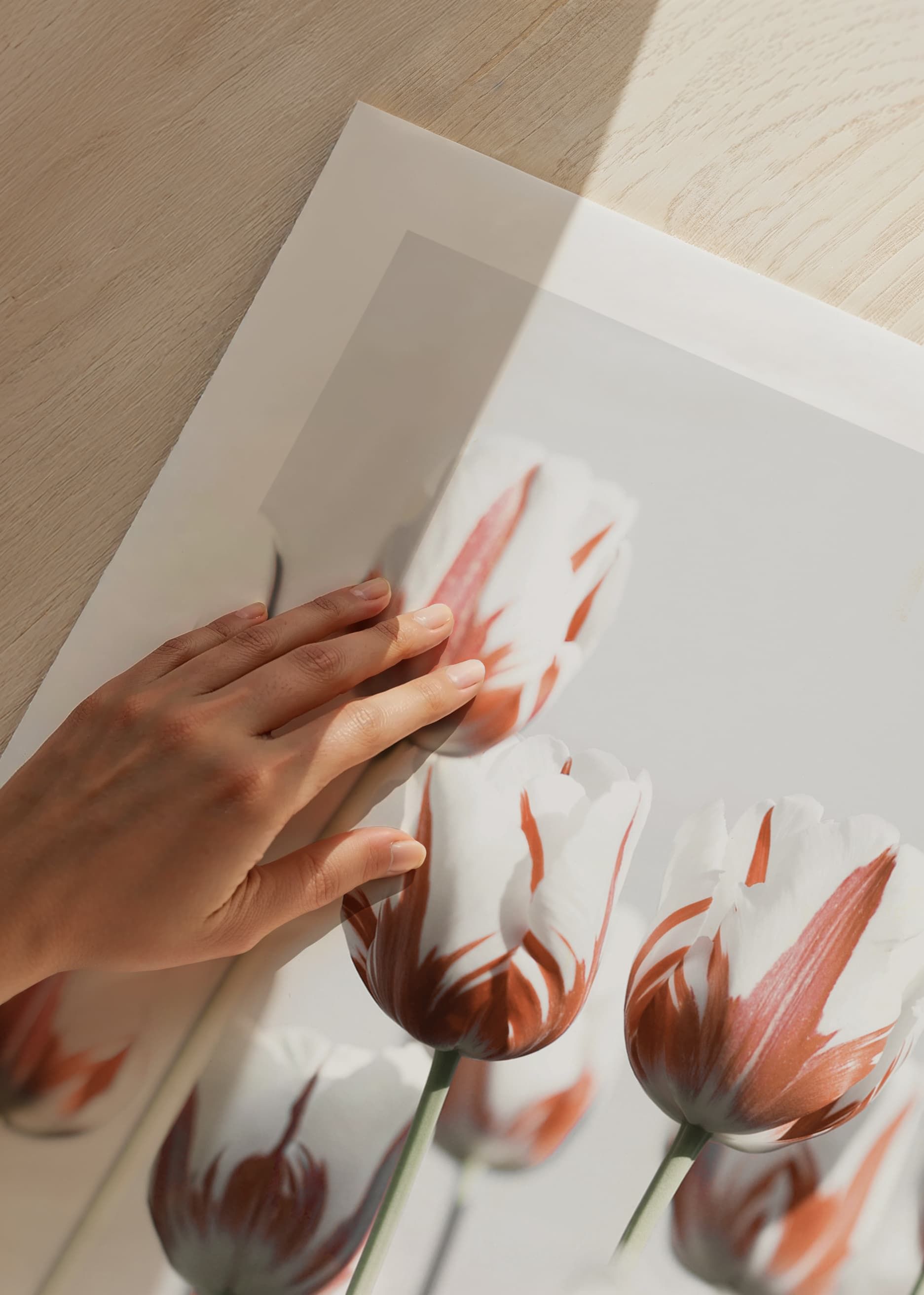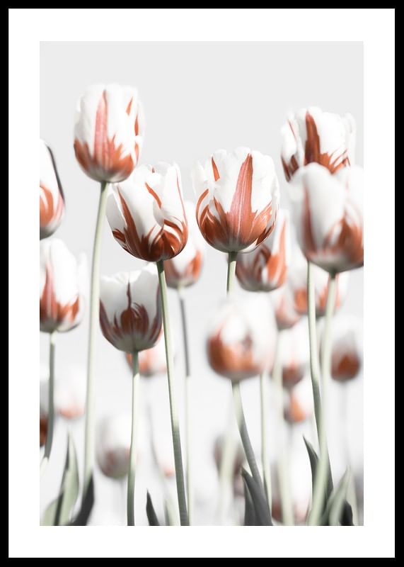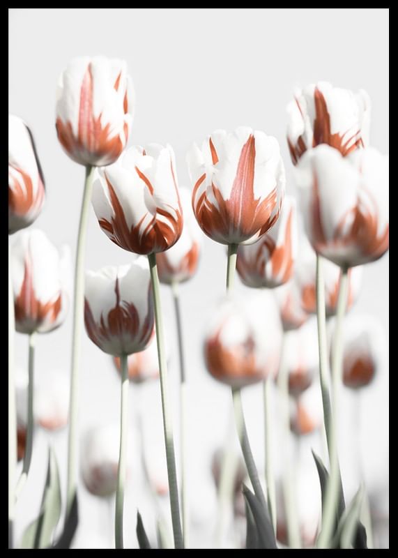 Stately white tulips with red streaks rise against a light, softly blurred background. The natural color palette with gentle green stems and subtle contrasts gives an airy and fresh impression. This poster adds a spring feeling and works well in both living rooms and kitchens where floral motifs are desired.