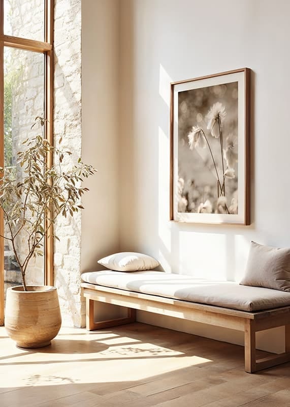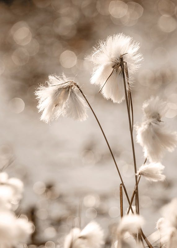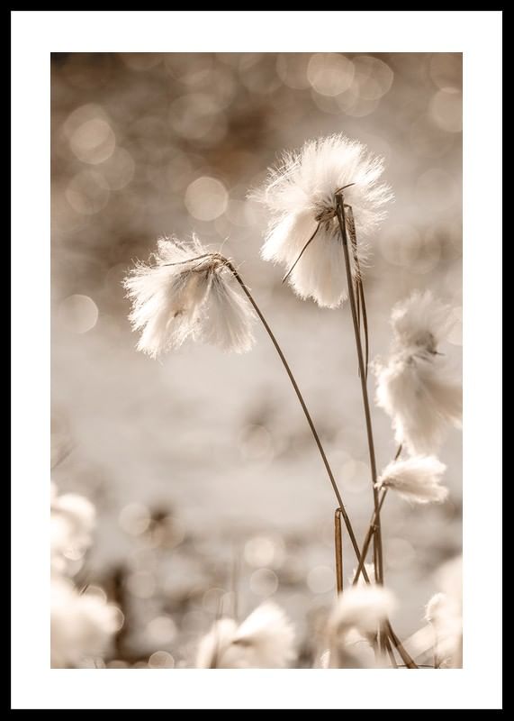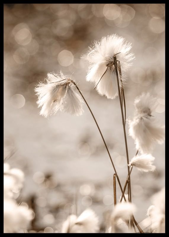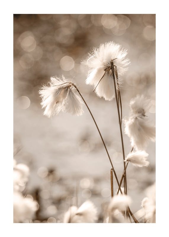 A close-up of cotton grass with light, fluffy tassels swaying in the wind against a softly blurred background in warm, muted beige tones. The understated composition highlights the texture of the plant and creates a calm and natural feel. A poster that adds a subtle autumn feel and is suitable for both living rooms and bedrooms.