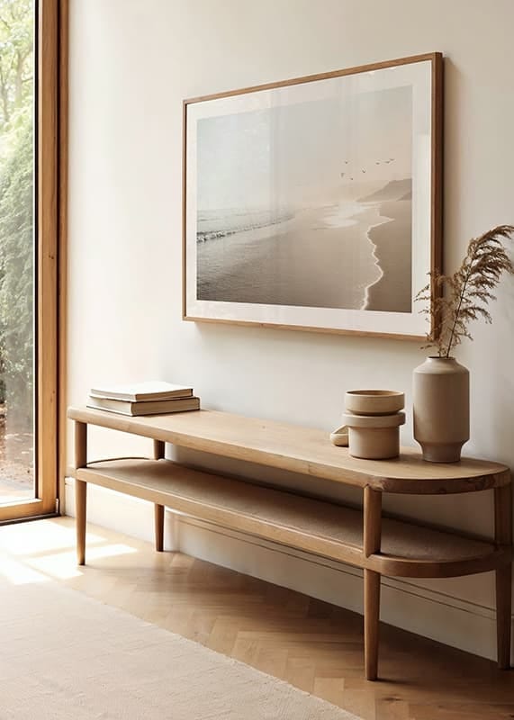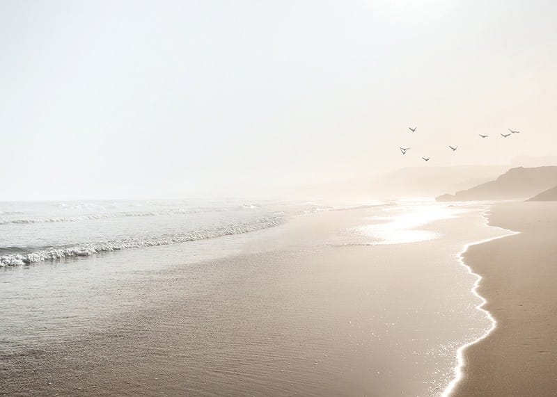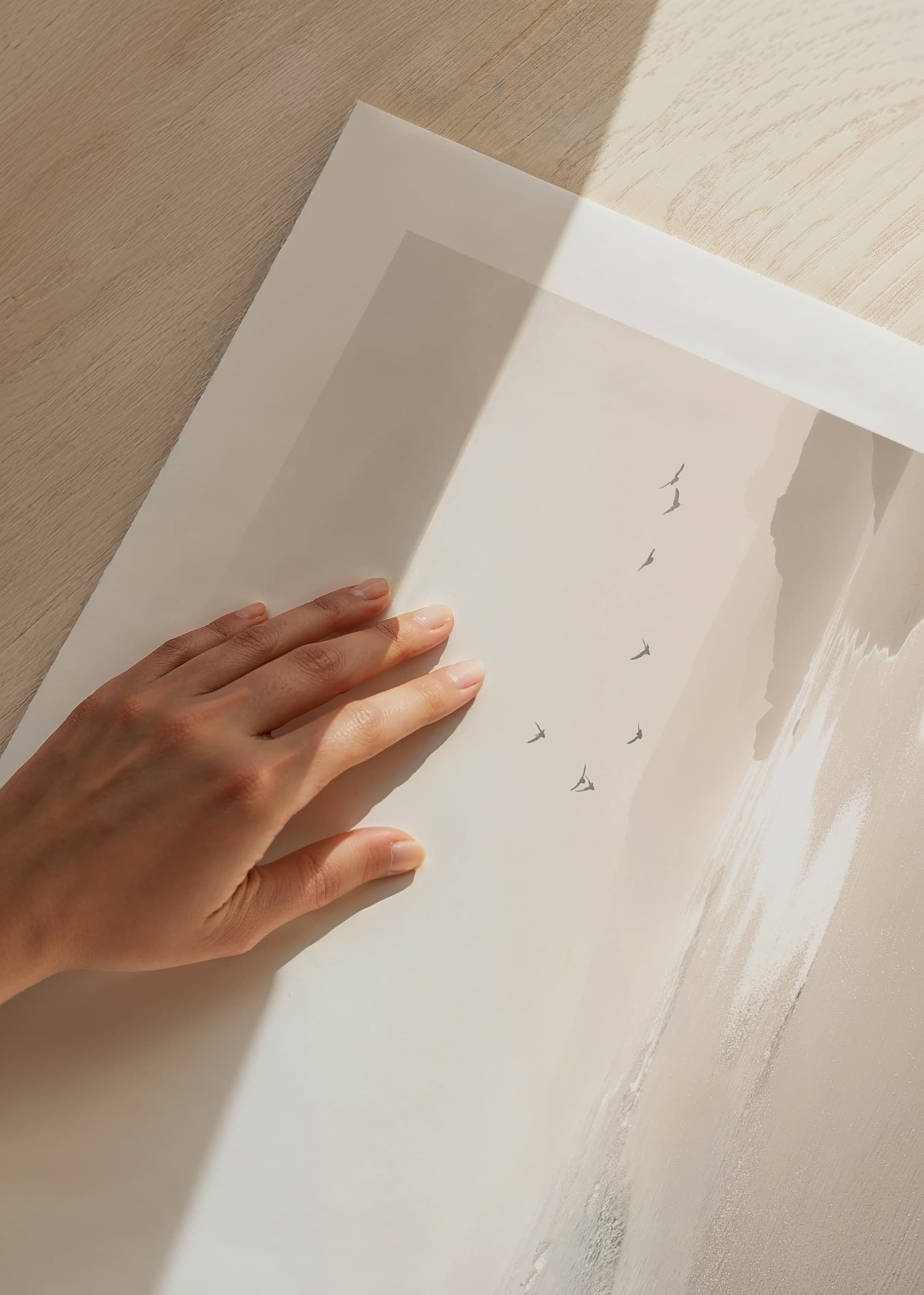 Waves meet light sand at Praia do Lagido where the sea spreads out towards the horizon. The morning light is filtered through mist and gives the motif soft, beige shades. A few birds are seen floating in the air above the shoreline. This poster gives a peaceful impression and fits well in calm, bright rooms or summer-inspired spaces.