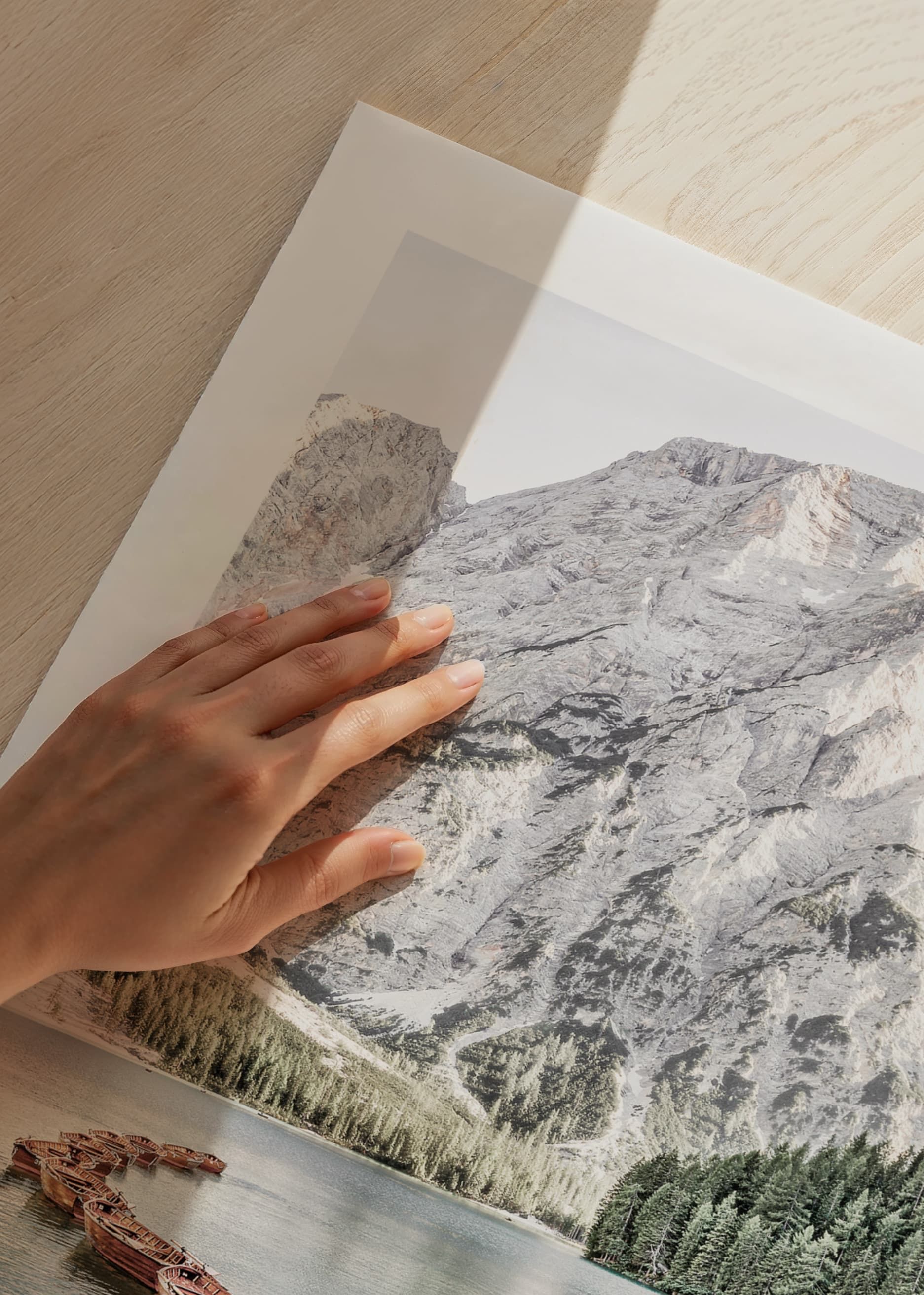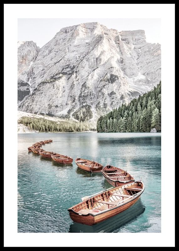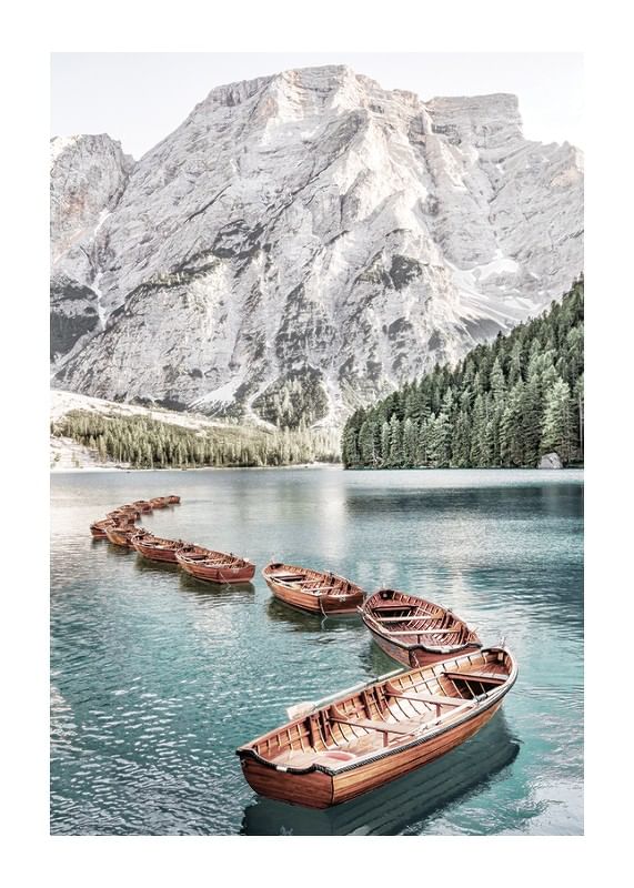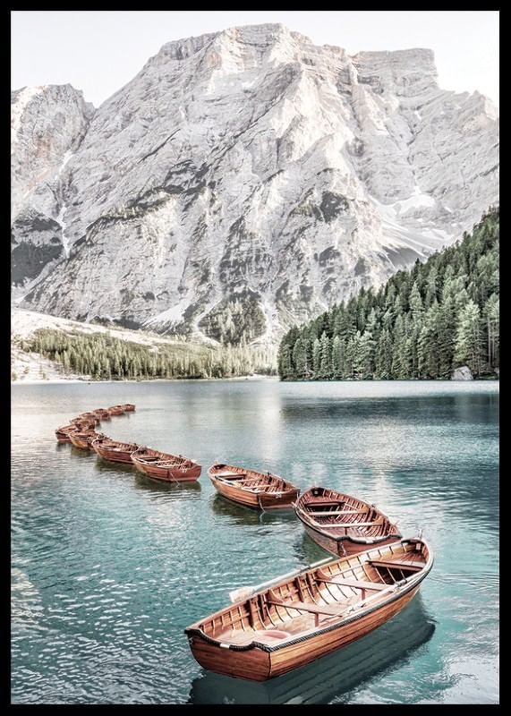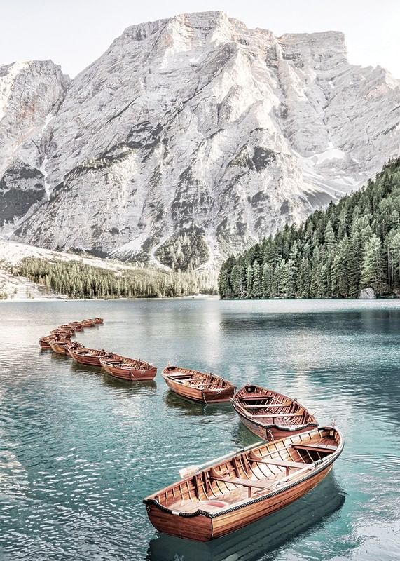 The row of classic wooden boats rest on the turquoise waters of Lake Braies, surrounded by dense spruce forests and high mountains in the background. The light cliff walls meet the mirror-like surface and create a tranquil environment. With its nature motif, this poster gives an airy feel to a living room or hallway.