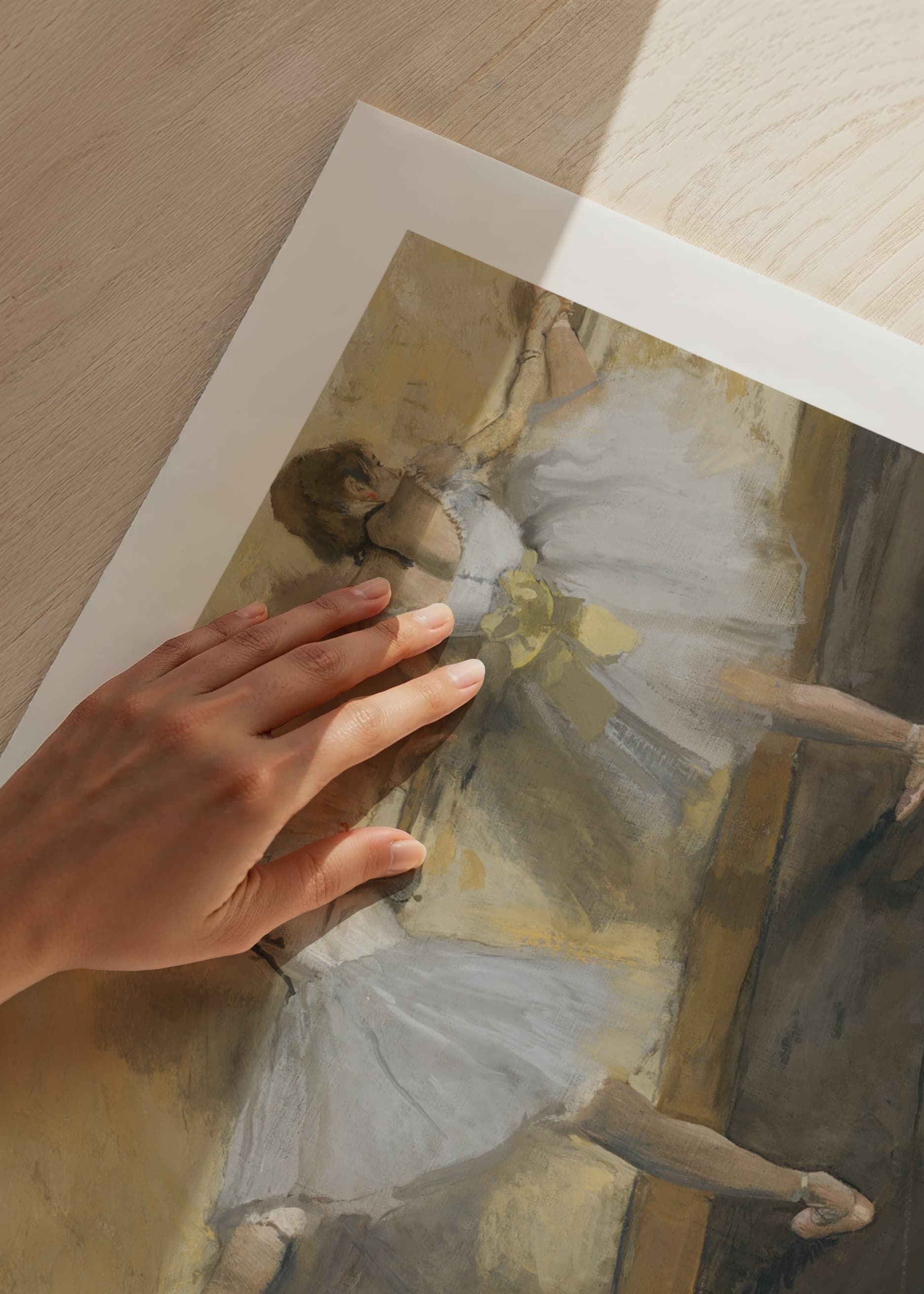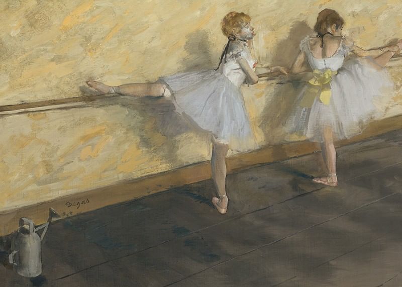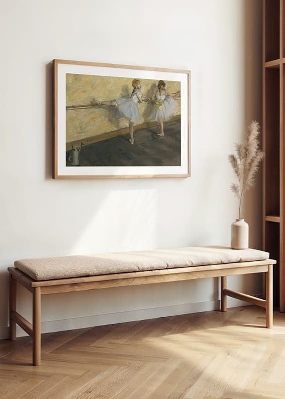 Poster with the painting "Dancers Practicing at the Barre" by the French artist Edgar Degas from the year 1877. The motif is a beautiful painting of two ballerinas practicing.