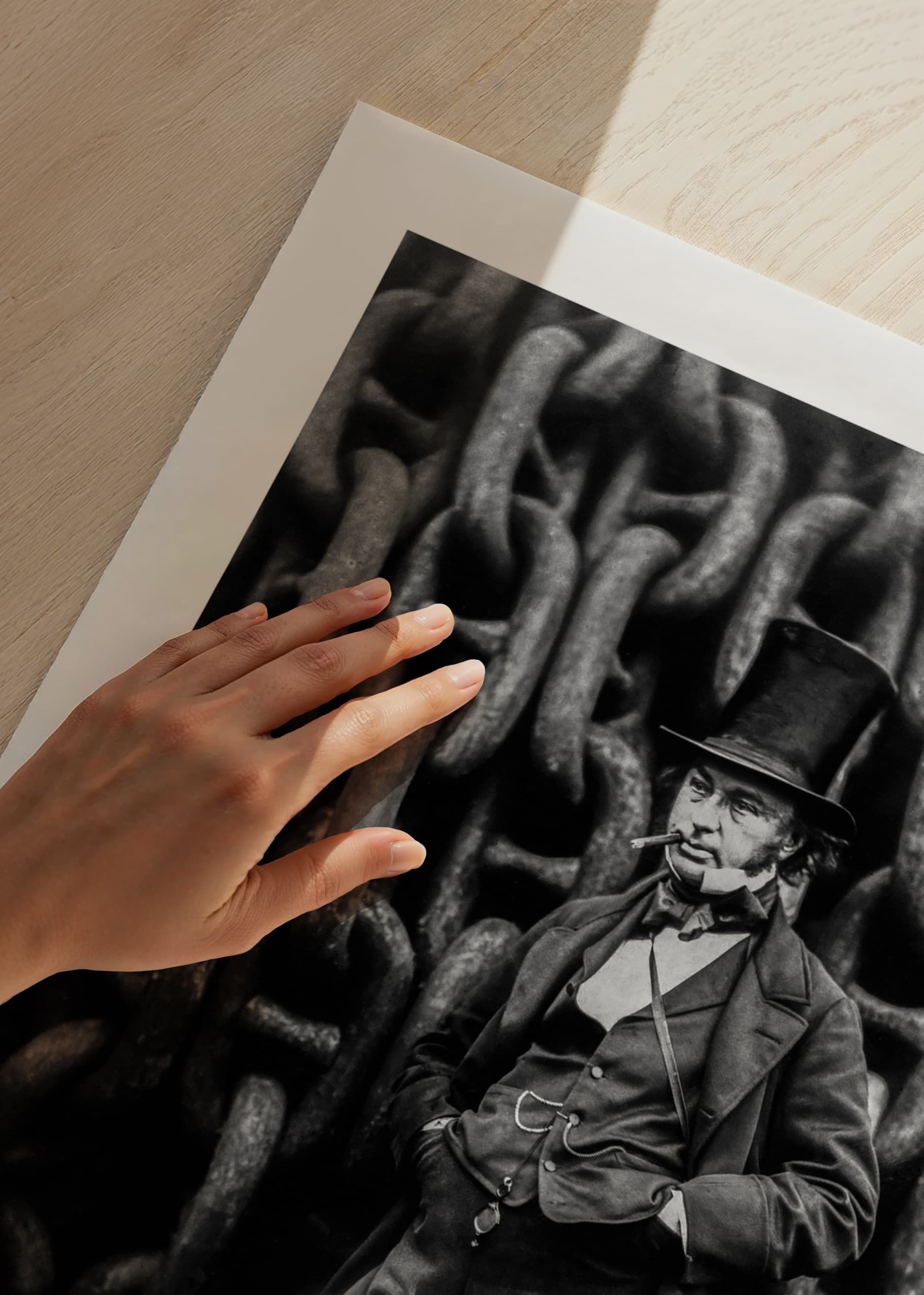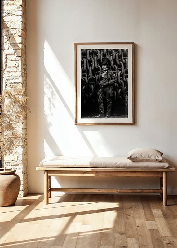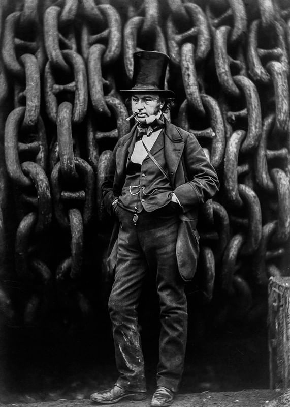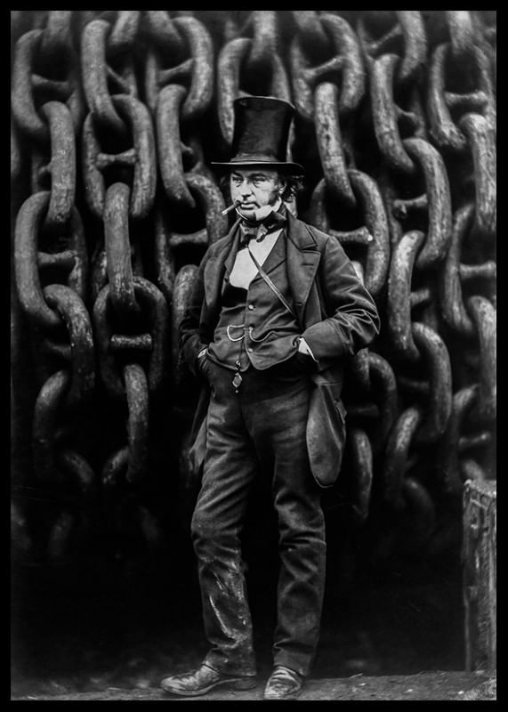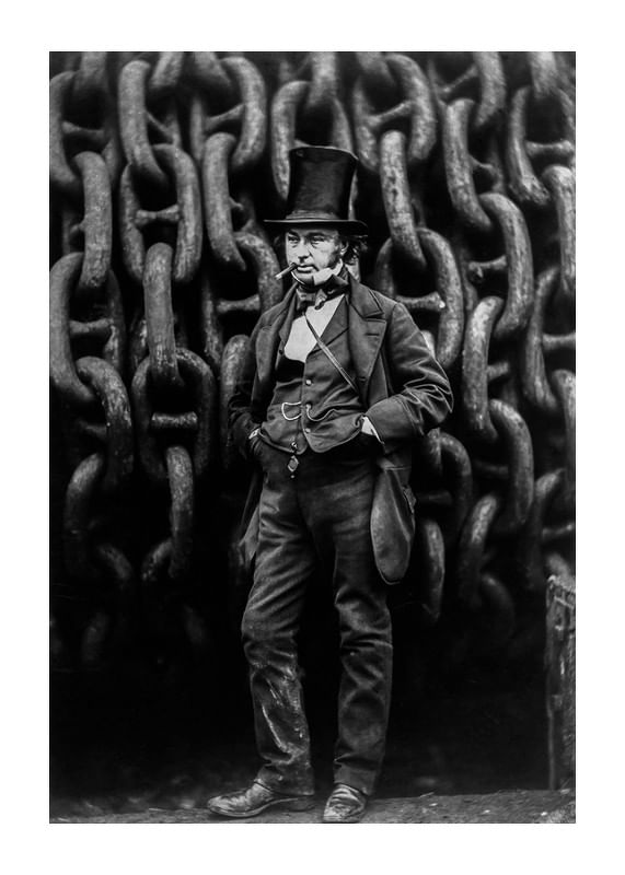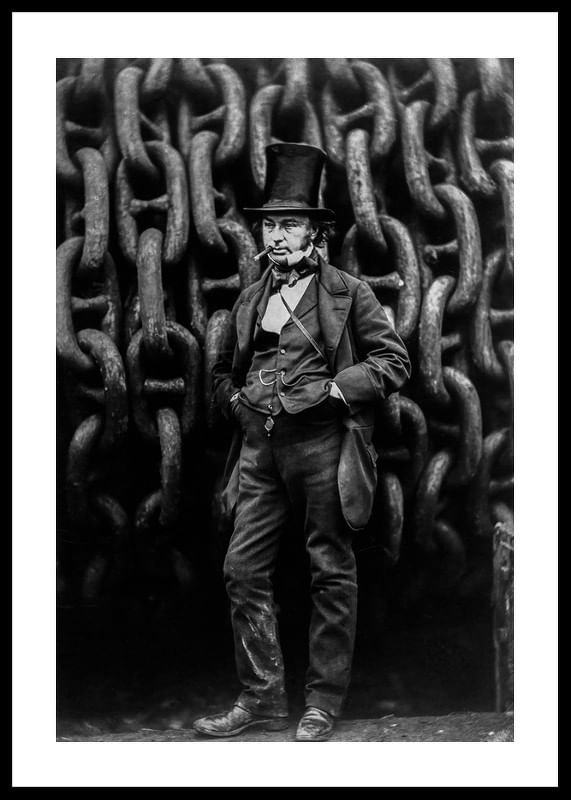 Poster featuring an 1857 black and white photograph of the engineer Isambard Kingdom Brunel standing in front of the chains of the ship he designed The Great Eastern. Isambard was behind large parts of the industrial revolution in England in the middle of the 19th century and was known for his magnificent constructions. The Great Eastern was the crowning glory of his work, the great pride of the nation and by far the largest ship that had ever been built at this time.