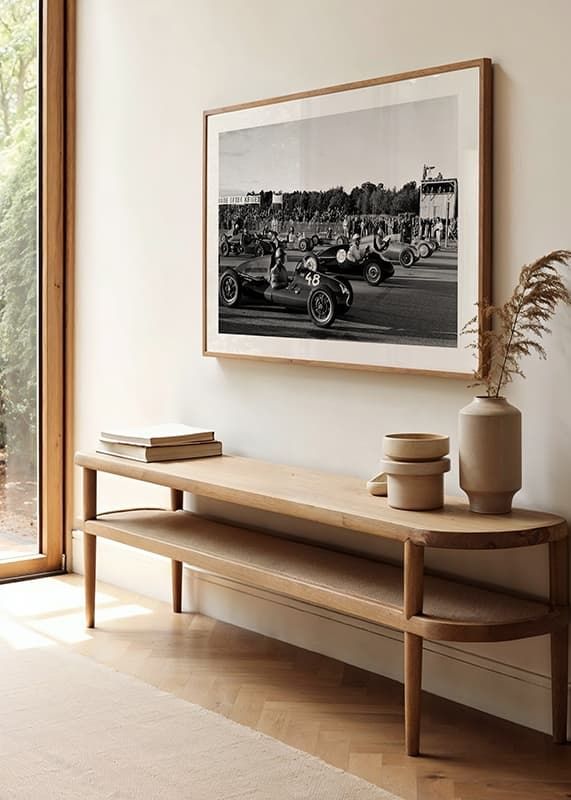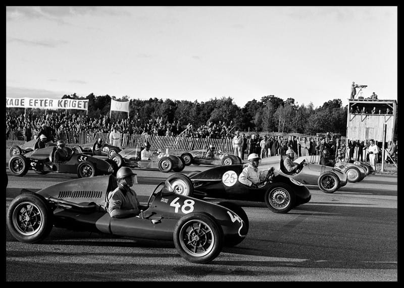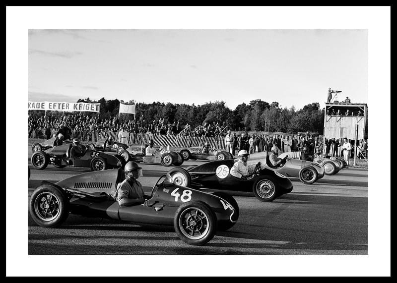 Poster with a black and white photograph from the motor race Skarpnäcksloppet in Stockholm in 1952.