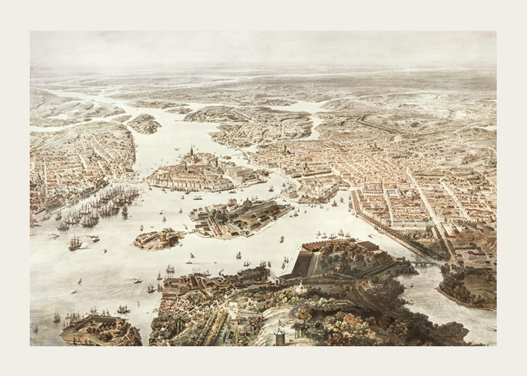Poster with a painting from the 1860s with a panorama of Stockholm. In the lower part of the picture you can see Djurgården, on the left Södermalm, in the middle the castle above Skeppsholmen and on the right the rest of Stockholm city: Gärdet, Östermalm, Vasastan, and at the top Kungsholmen.