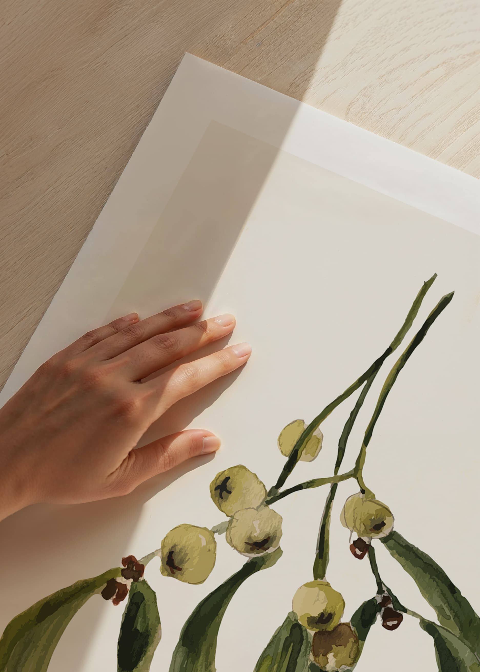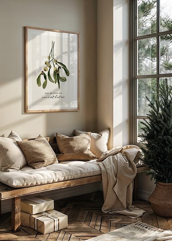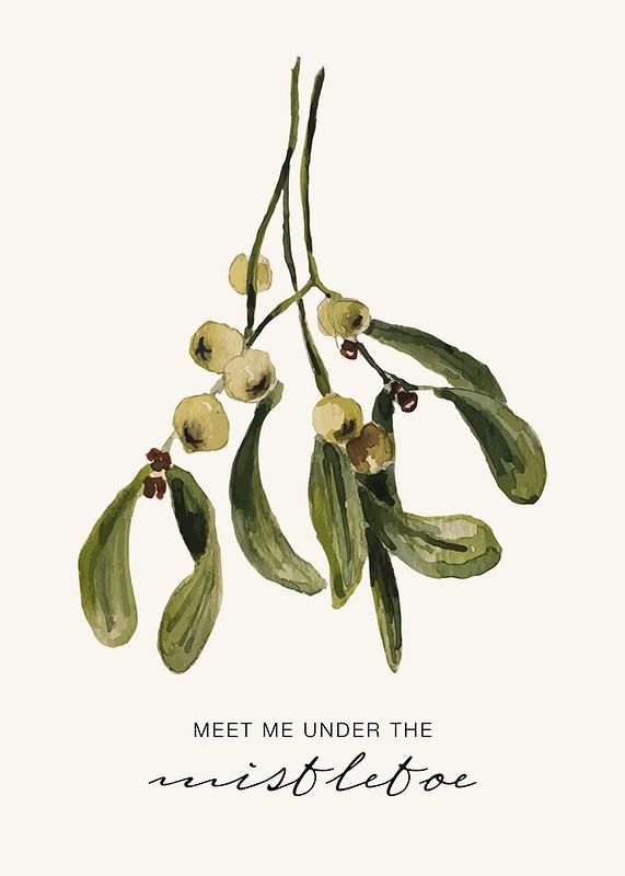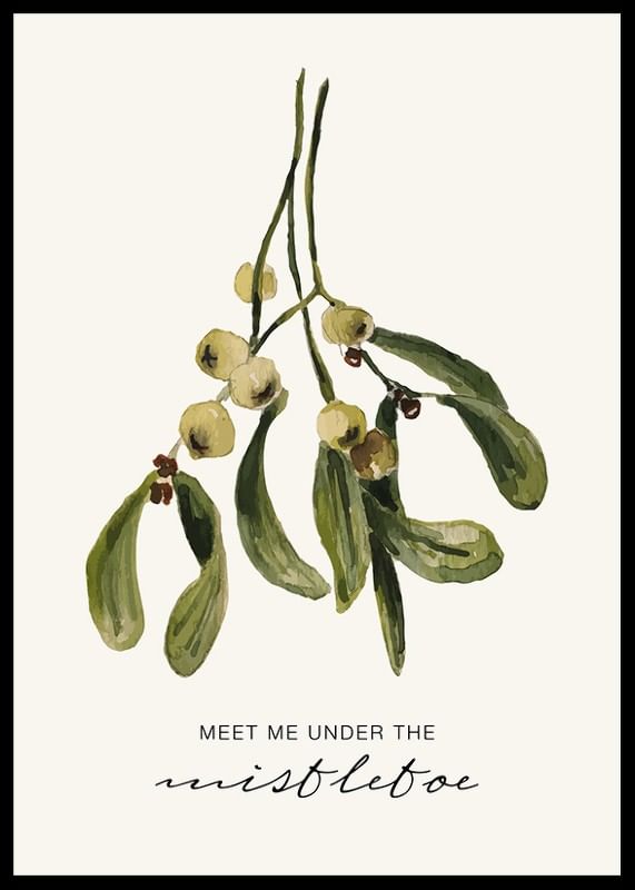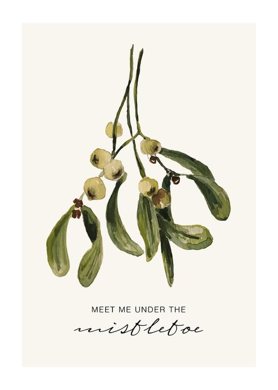 Mistletoe sprig in watercolor style with oblong green leaves and bright berries against a light beige background. Under the plant is the text 'Meet me under the mistletoe' in simple and cursive style. This poster gives a seasonal feel and fits nicely in the hallway, living room or with Christmas decorations.