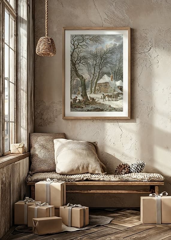 A thatched farmhouse with snow-covered ridges is surrounded by frozen trees in a winter landscape. A couple of men chop wood in front of the house while a horse and cart wait next to it. Gray clouds and winter colors characterize the motif. This poster fits nicely in homes where you want to create a rural and seasonal feel.