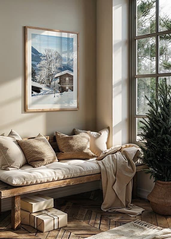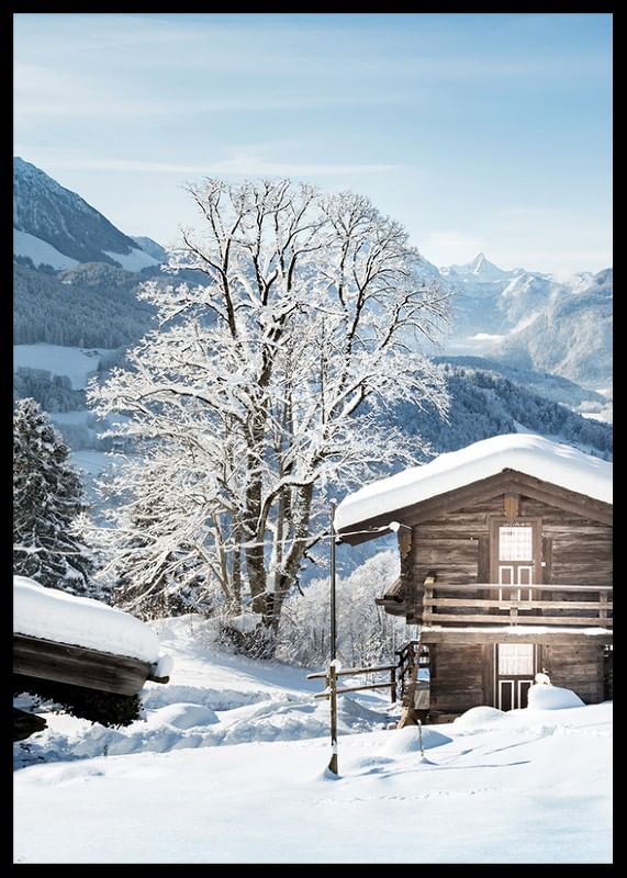 The motif consists of a small wooden cabin with a snow-covered roof surrounded by untouched snow masses. In the background, a large tree with branches covered in frost is visible, as well as mountains rising against a clear blue sky. The light creates a cold but bright atmosphere. This poster creates a distinct winter feeling in the home and fits well in the living room or hallway.