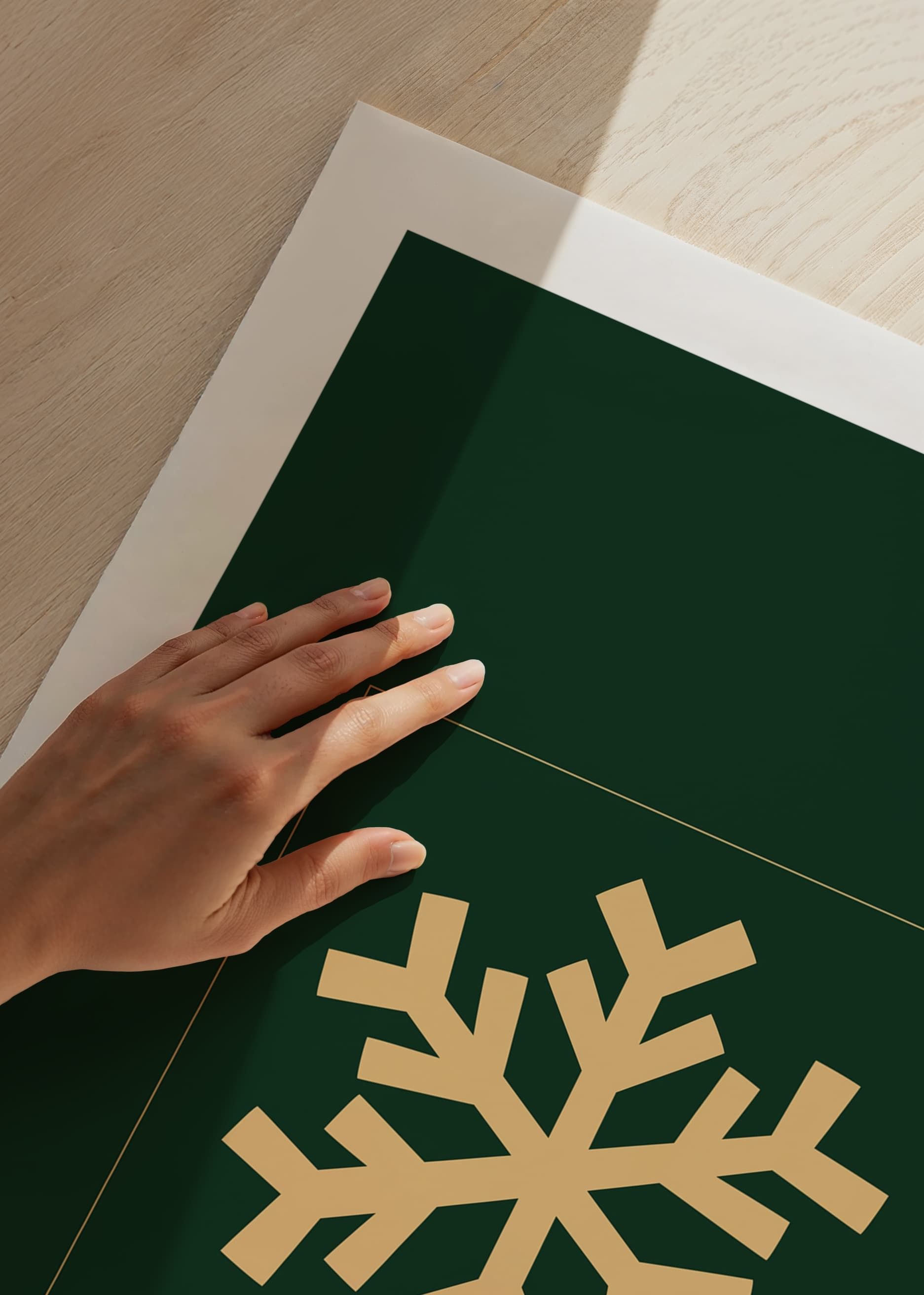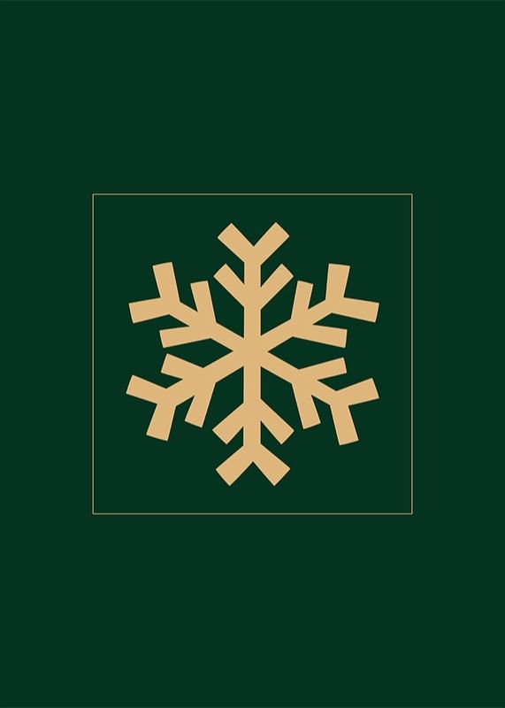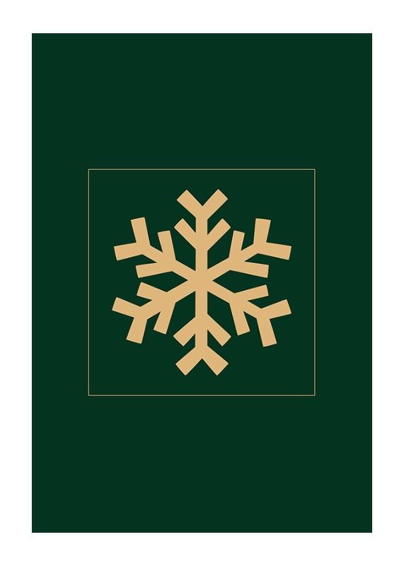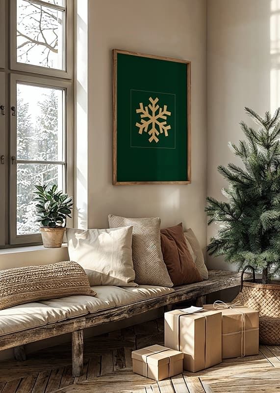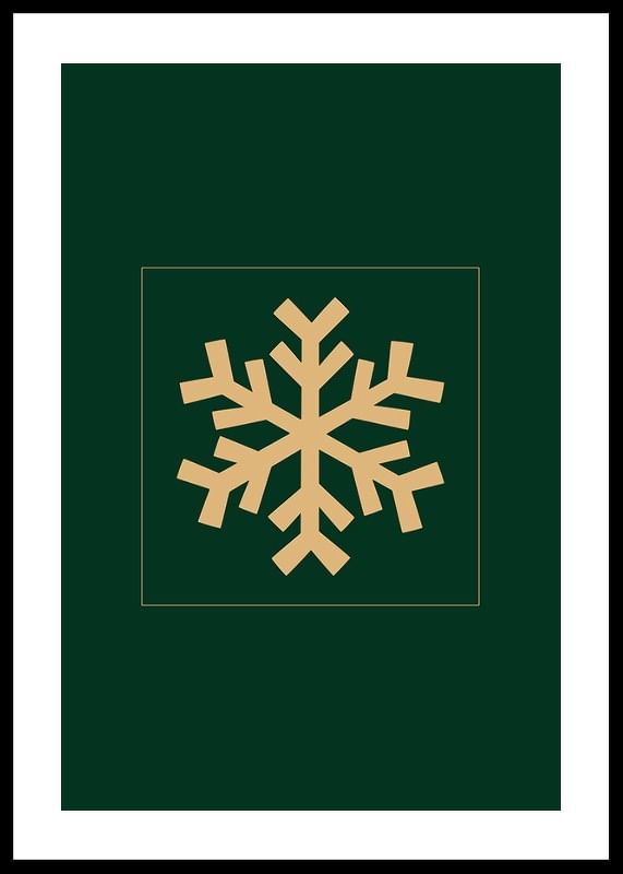 The motif consists of a stylized snowflake in matte gold centered on a dark green square background. The simple and graphic shape gives a modern feel, while the color choice brings to mind winter and Christmas. This poster fits well in the living room or hallway during the winter season.