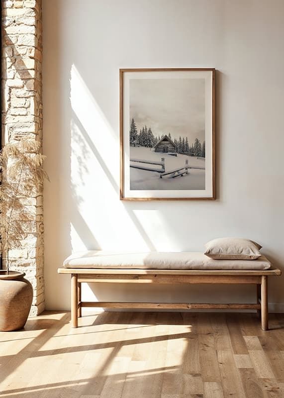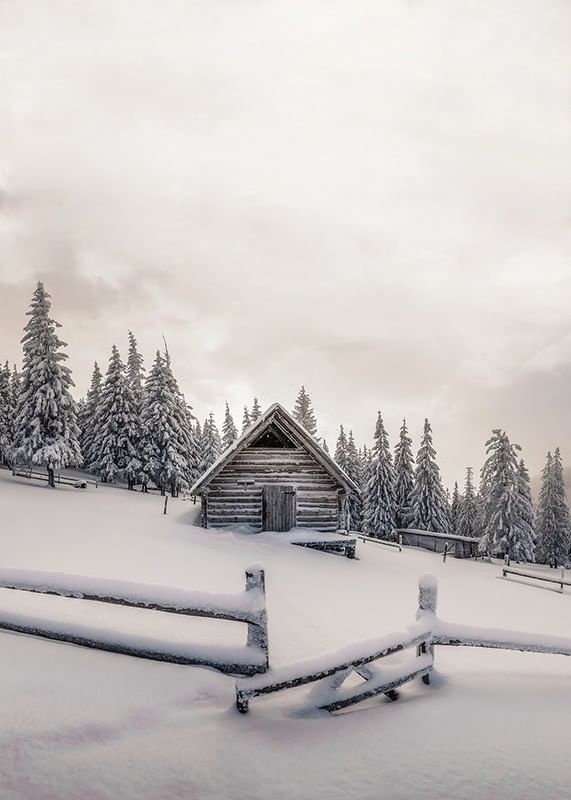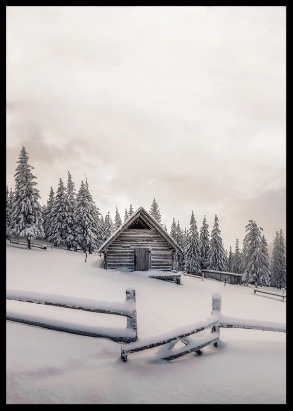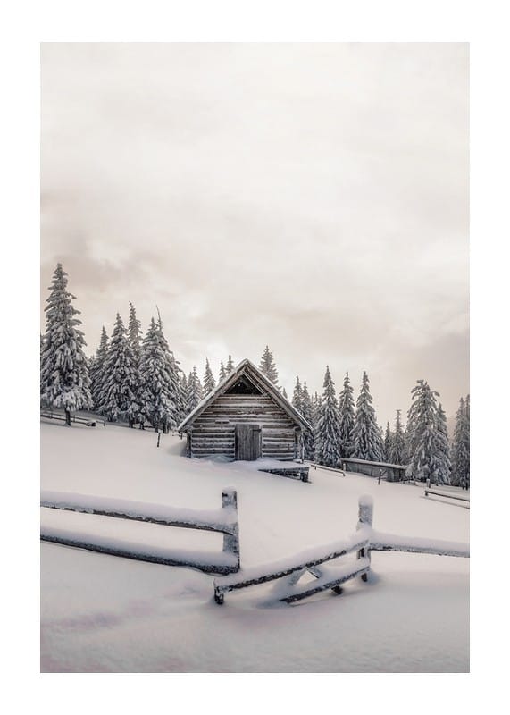 A lone log cabin surrounded by snow-covered fir trees and a white landscape stands at the center of the motif. An older wooden gate in the foreground enhances the feeling of seclusion, while the sky has soft, muted tones. This poster gives a peaceful winter feel and works well in rooms where nature's seasons are appreciated.