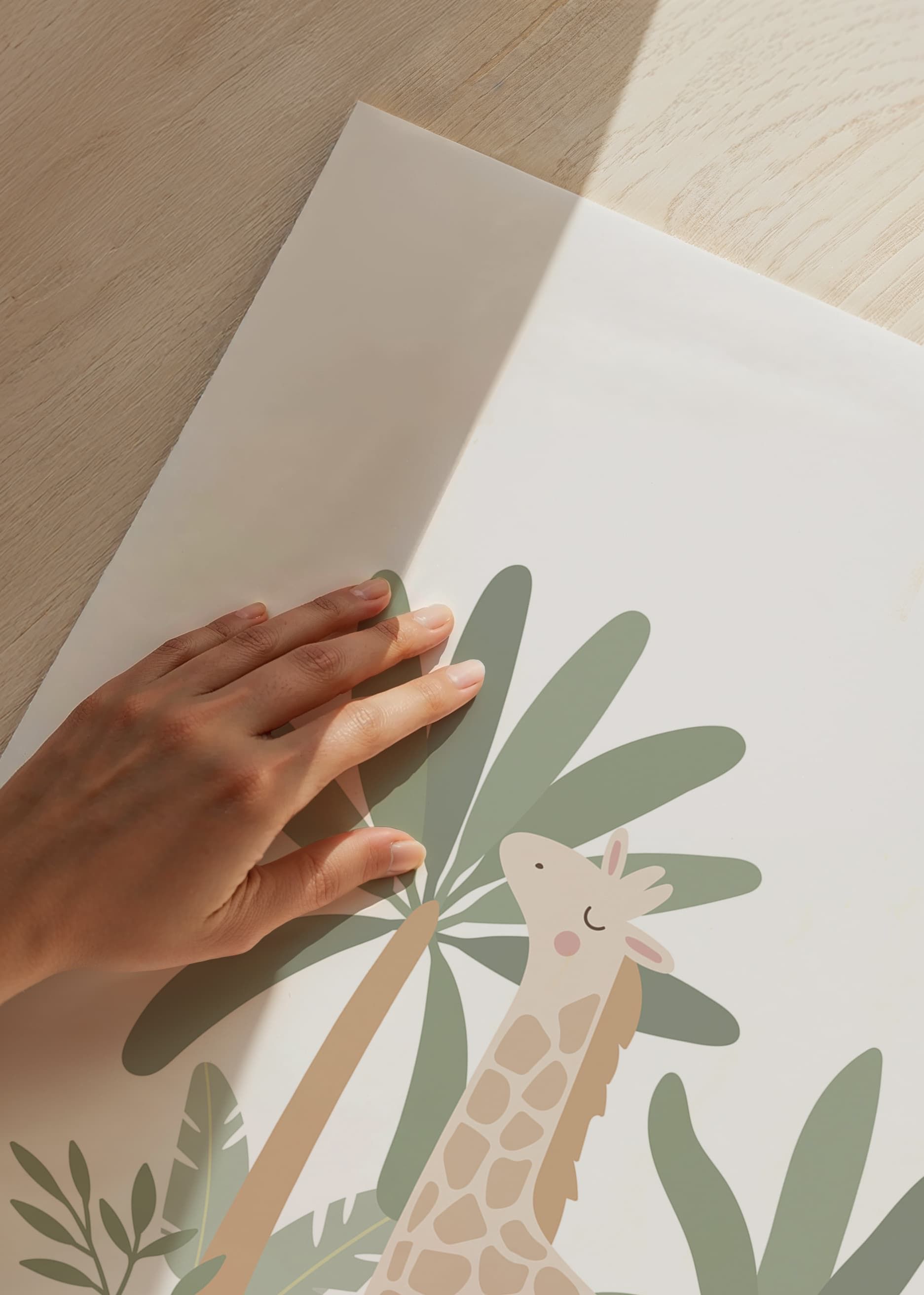 The motif shows a stylized giraffe standing among palm trees and foliage in muted, green and beige tones. Below the motif is the text "Born to be wild" in matching color. This poster has a playful but understated expression and is suitable for both children's rooms and play areas where a soft and natural element is appreciated.