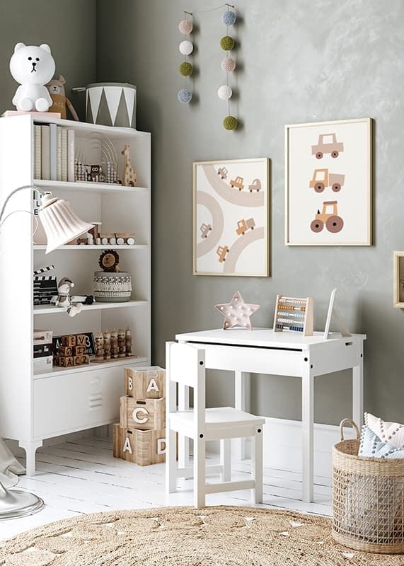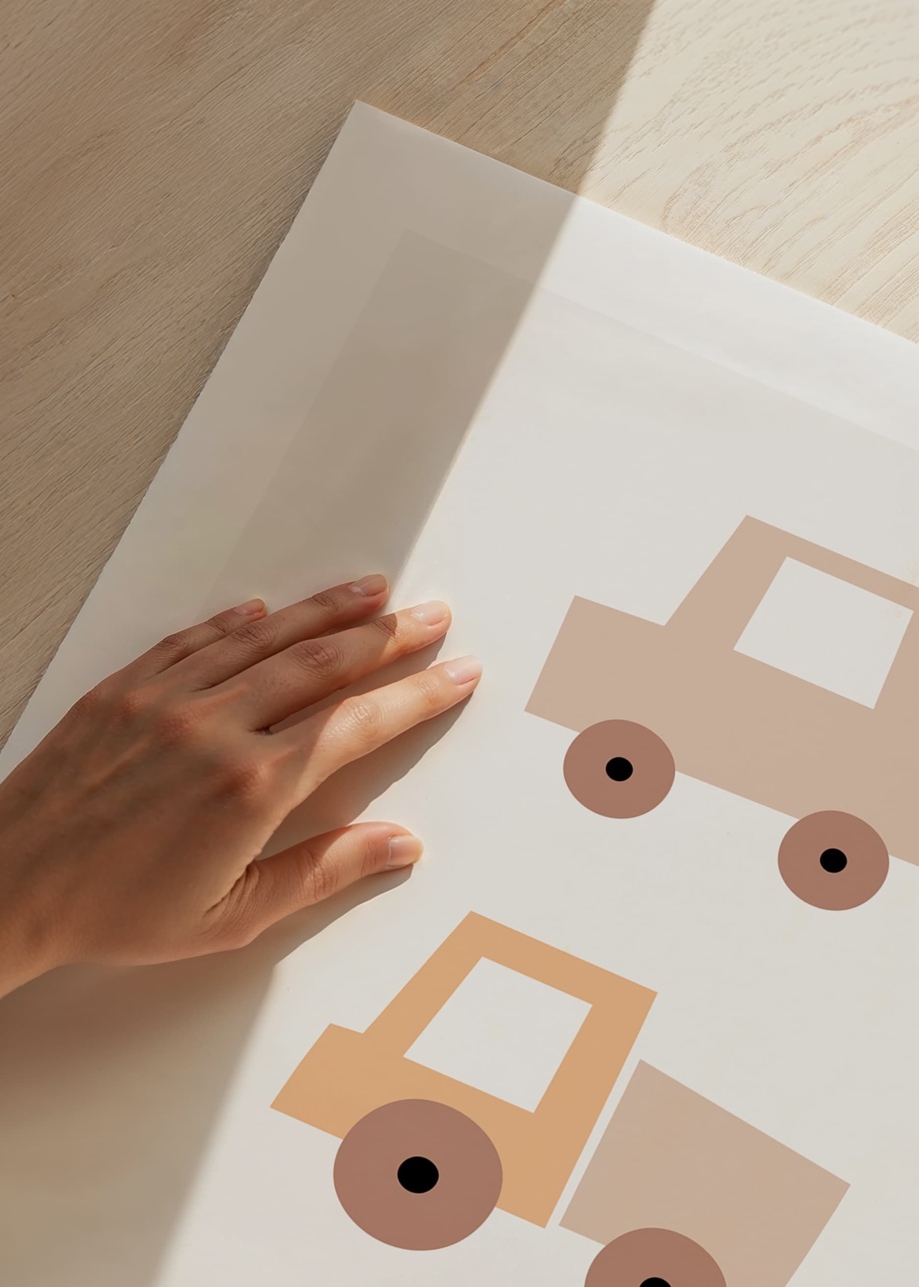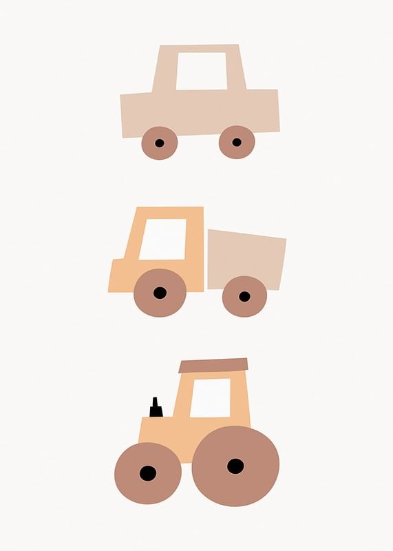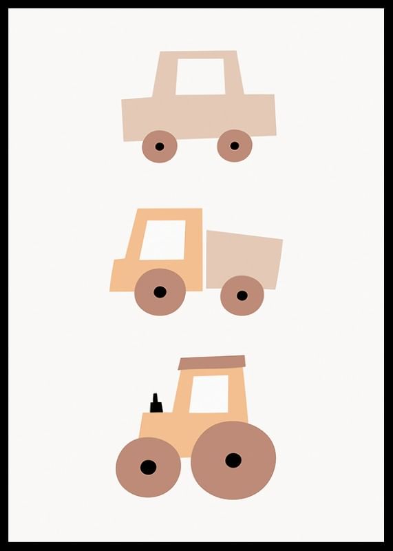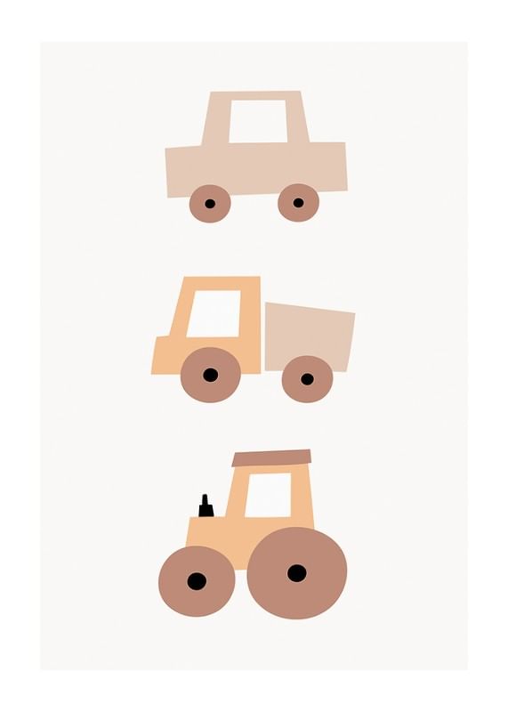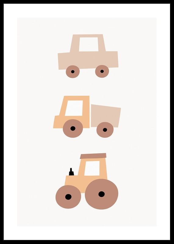 Three vehicles in a stylized illustration – a car, a truck and a tractor – are seen in soft beige, brown and sand tones against a light background. The simple design makes the motif easily accessible to young children. This poster fits nicely in a children's room and contributes to a calm, playful environment where the shape speaks for itself.