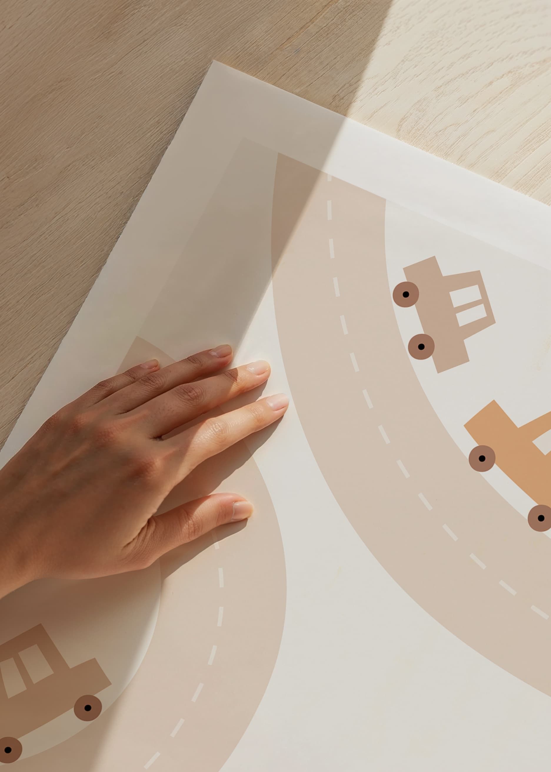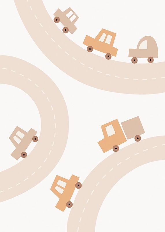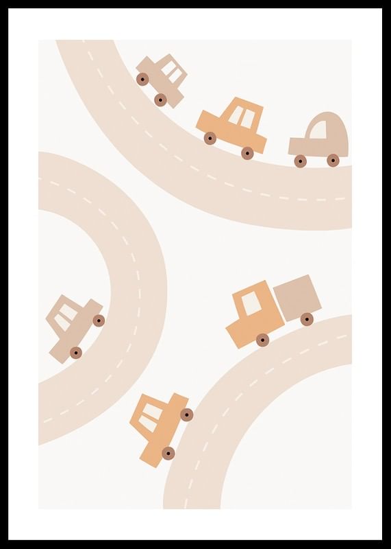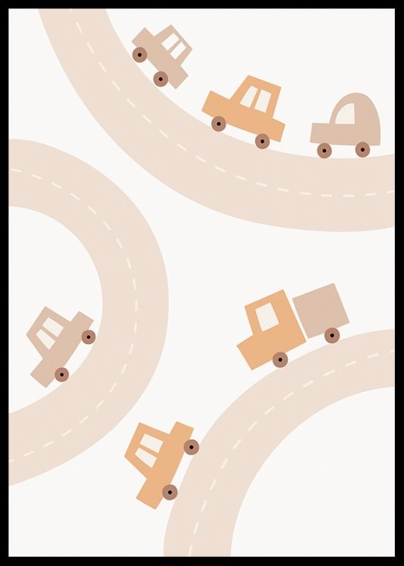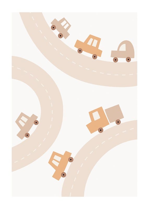 Graphic toy cars in various shapes and sizes drive along gently curving roads against a light sand-colored background. The muted beige and brown tones give a calm and playful impression that fits nicely in a child's room. This poster adds a soft color scale and clear playfulness to the room without being too dominant.