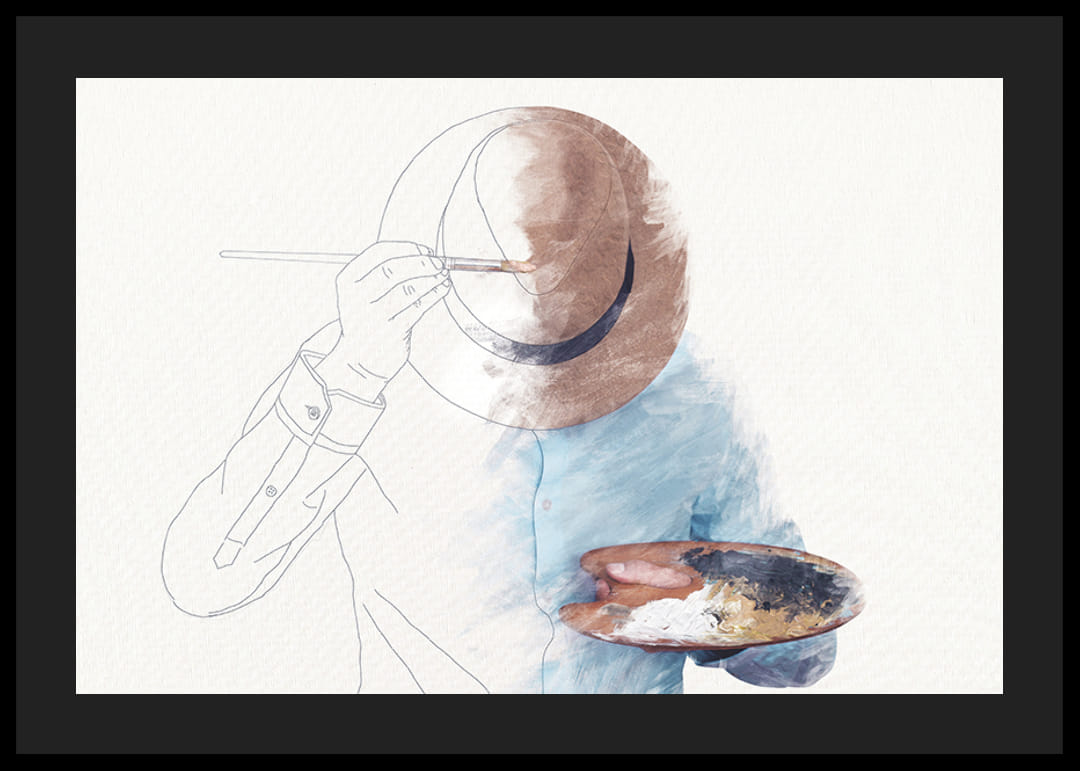 A man is depicted partly in line drawing and partly in soft watercolors. He holds a palette and paints his own face and hat with a brush, giving a surreal feel. The poster combines artistic freedom with self-reflection and is perfect for creative spaces or work spaces.