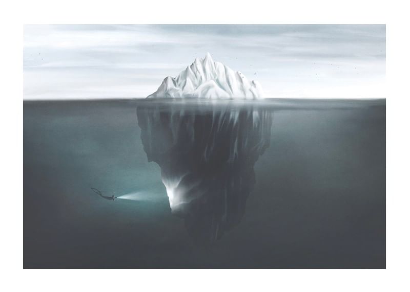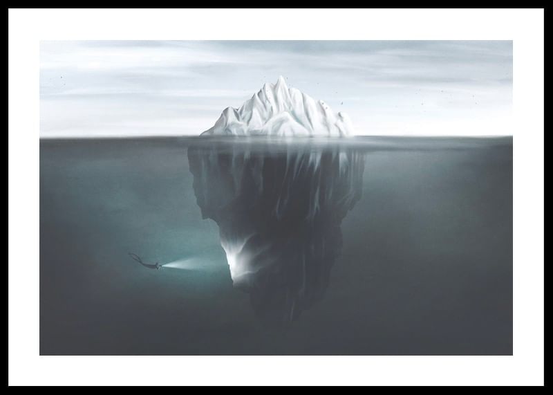 A large iceberg rises from the still water, revealing its hidden volume beneath the surface. A lone diver with a flashlight swims towards the underwater part of the iceberg in faint blue-gray tones. Conceptual poster that reminds us that much lies hidden beneath the surface and fits well in the office or living room.