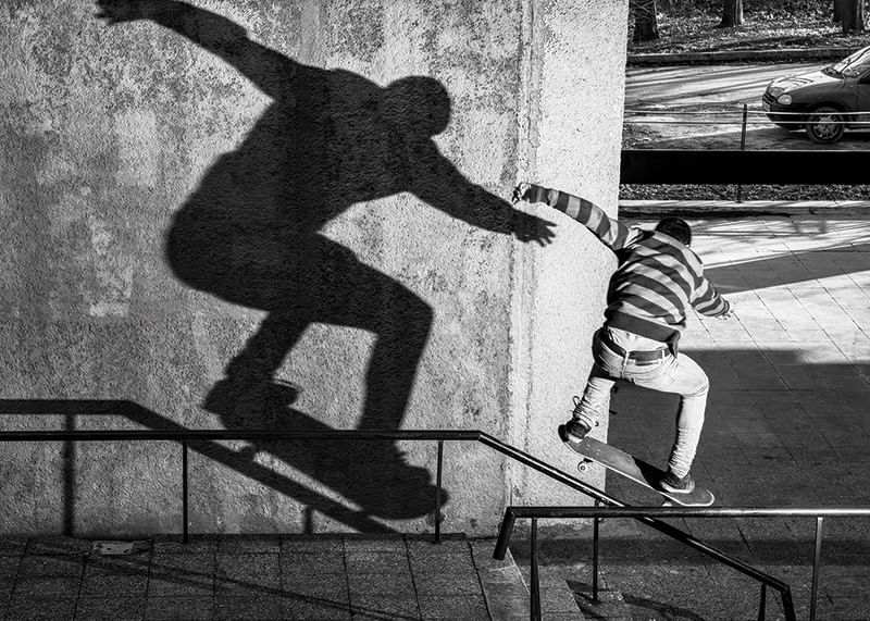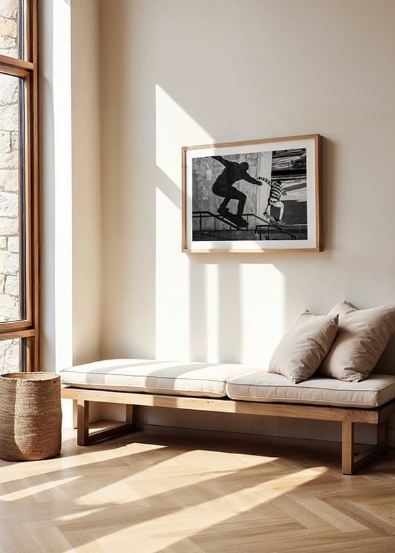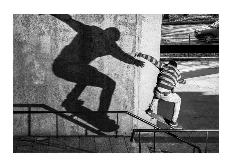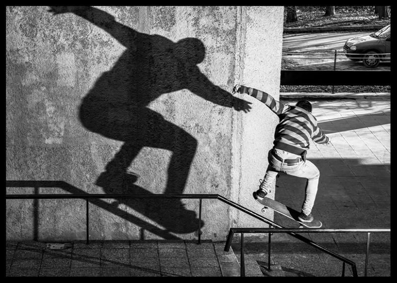Motion is captured in black and white as a skateboarder glides along a railing in the suburbs. A contrasting shadow is seen on a concrete wall, adding extra dynamism to the subject. Modern urban environments and urban culture meet in this poster, which works great in youth rooms or creative workspaces.