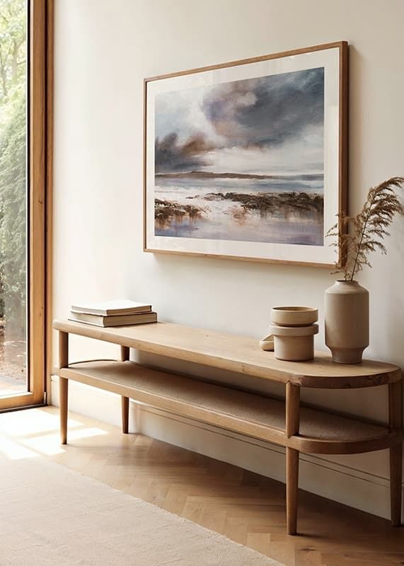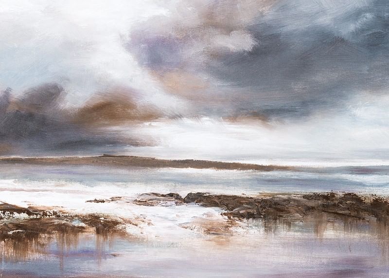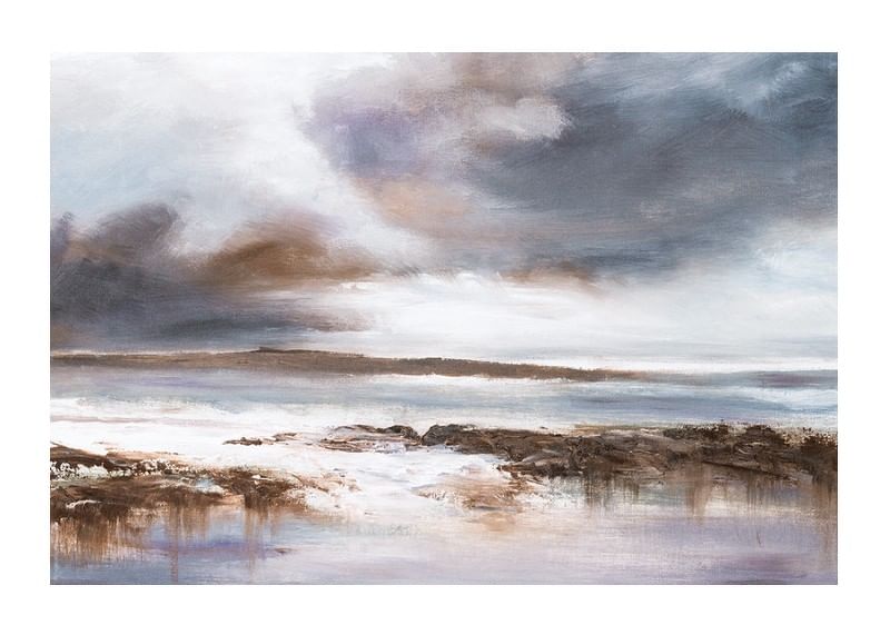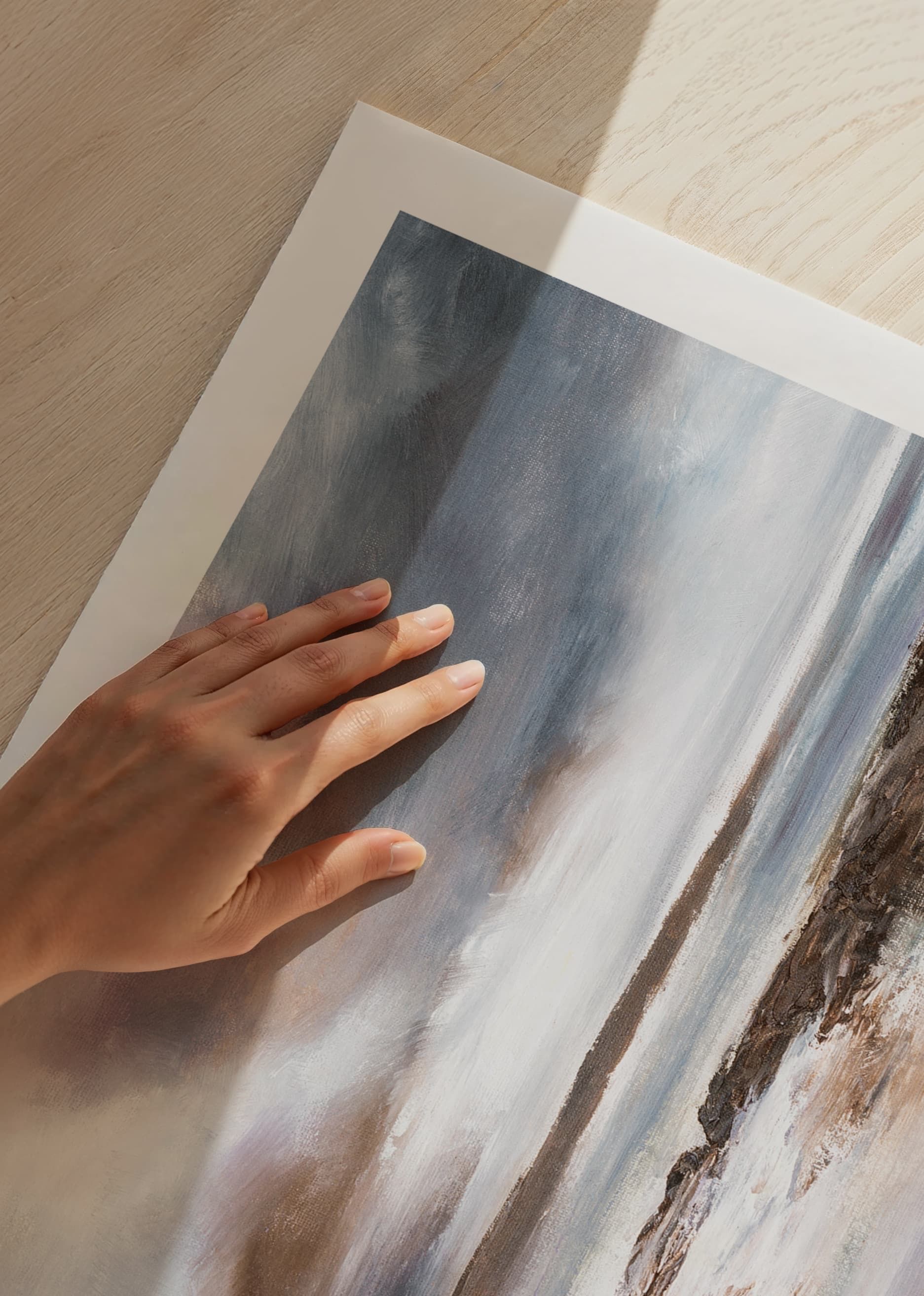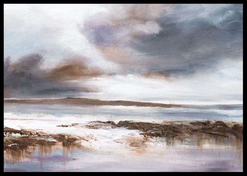 Coastal landscape with dramatic clouds and sea in soft, earthy colors. Brushstrokes in brownish gray and blue-white give an abstract feel where rocks meet water. This poster fits in both living rooms and bedrooms where a calm but expressive atmosphere is desired and works just as well alone as in a picture collage.