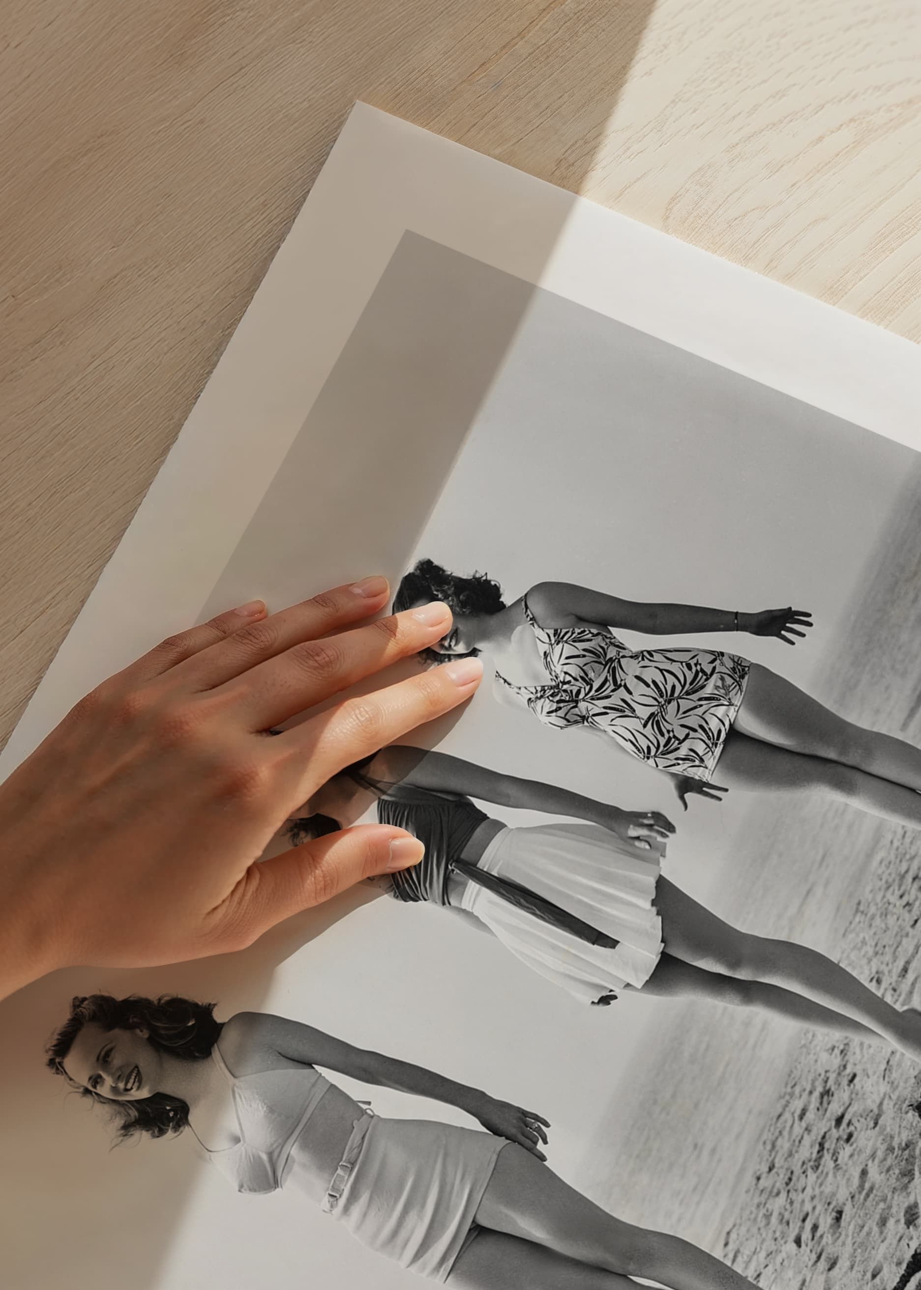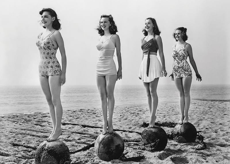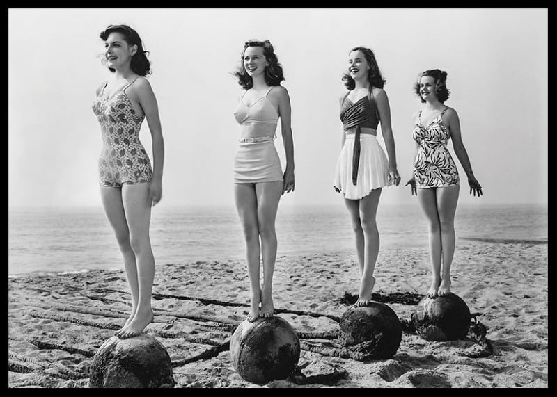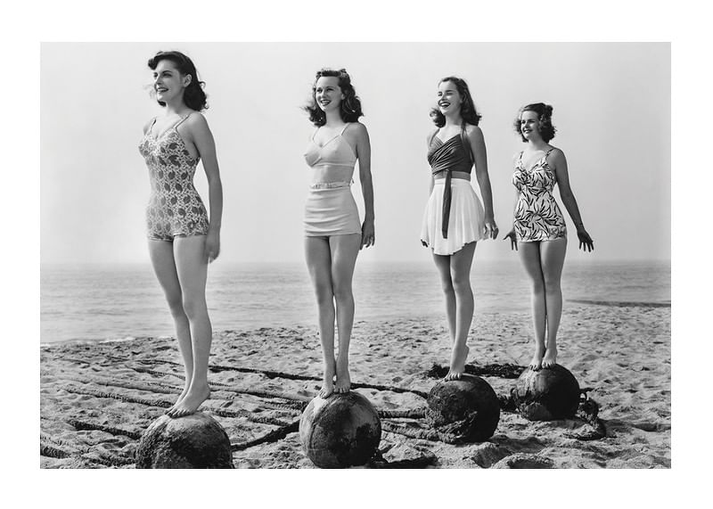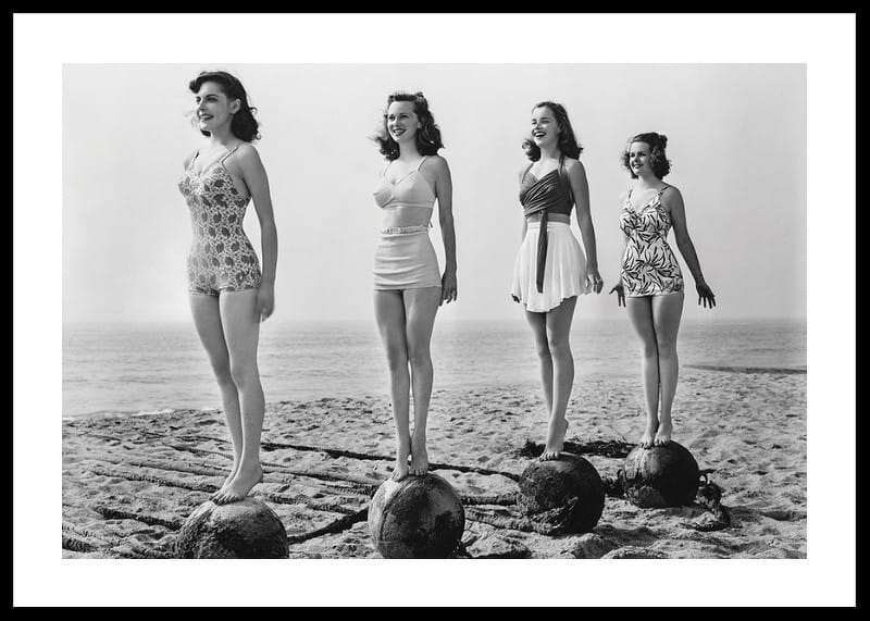Four women in period swimsuits balance standing on large balls at the edge of the beach, with the sea as a backdrop. The black and white vintage character captures a playful and nostalgic atmosphere. A poster that gives a touch of retro and the timeless joy of summer to your living room, hallway or bathroom.
